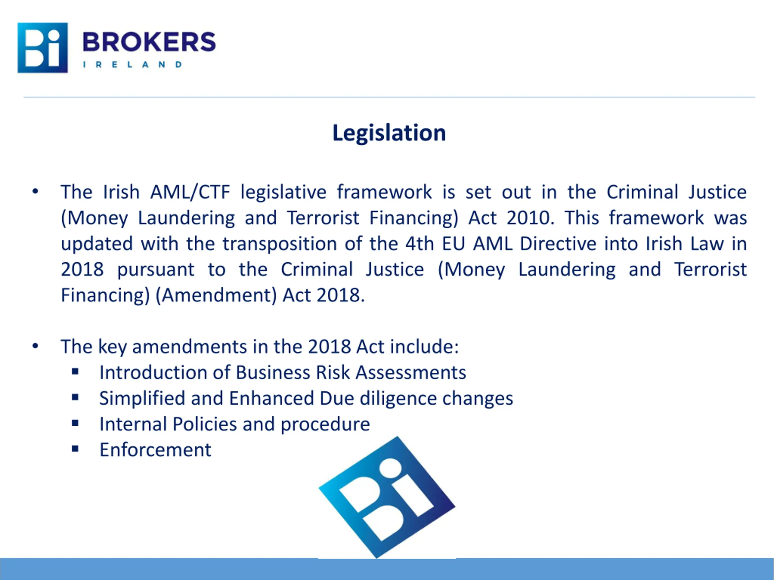 Legislation The Irish AML/CTF legislative framework is set out in the Criminal Justice (Money Laundering and Terrorist Financing) Act 2010. This framework was updated with the transposition of the 4th EU AML Directive into Irish Law in 2018 pursuant to the Criminal Justice (Money Laundering and Terrorist Financing) (Amendment) Act 2018. The key amendments in the 2018 Act include: Introduction of Business Risk Assessments Simplified and Enhanced Due diligence changes Internal Policies and procedure Enforcement