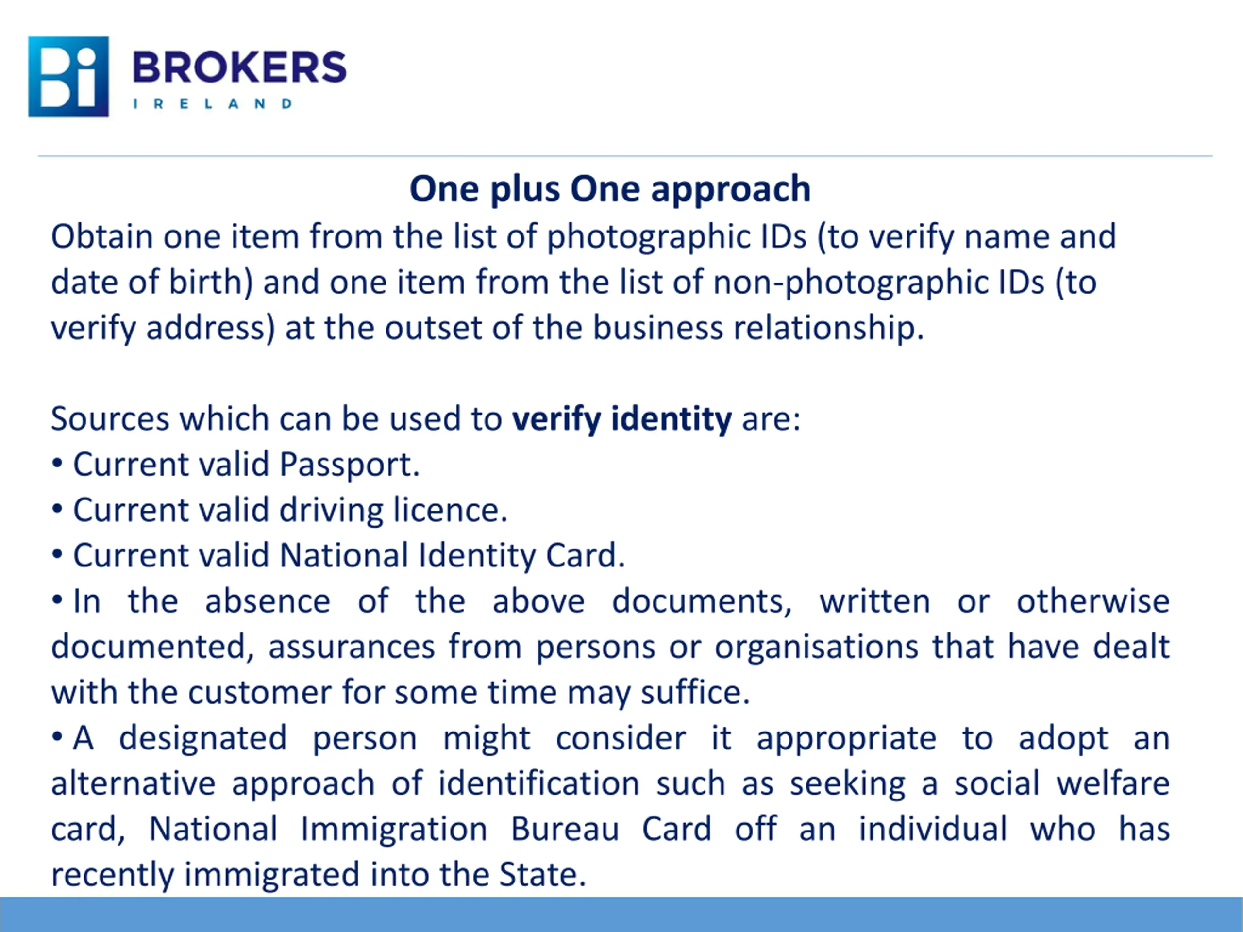 One plus One approach Obtain one item from the list of photographic IDs (to verify name and date of birth) and one item from the list of non-photographic IDs (to verify address) at the outset of the business relationship. Sources which can be used to verify identity are: Current valid Passport. Current valid driving licence. Current valid National Identity Card. In the absence of the above documents, written or otherwise documented, assurances from persons or organisations that have dealt with the customer for some time may suffice. A designated person might consider it appropriate to adopt an alternative approach of identification such as seeking a social welfare card, National Immigration Bureau Card off an individual who has recently immigrated into the State.