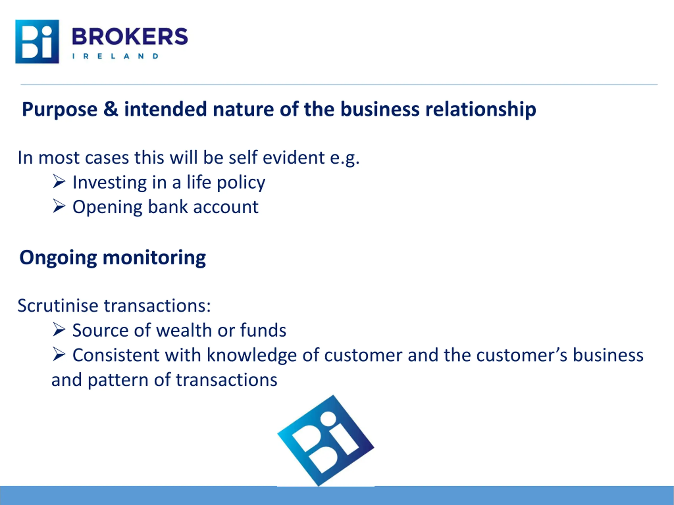 Purpose & intended nature of the business relationship In most cases this will be self evident e.g. Investing in a life policy Opening bank account Ongoing monitoring Scrutinise transactions: Source of wealth or funds Consistent with knowledge of customer and the customer s business and pattern of transactions