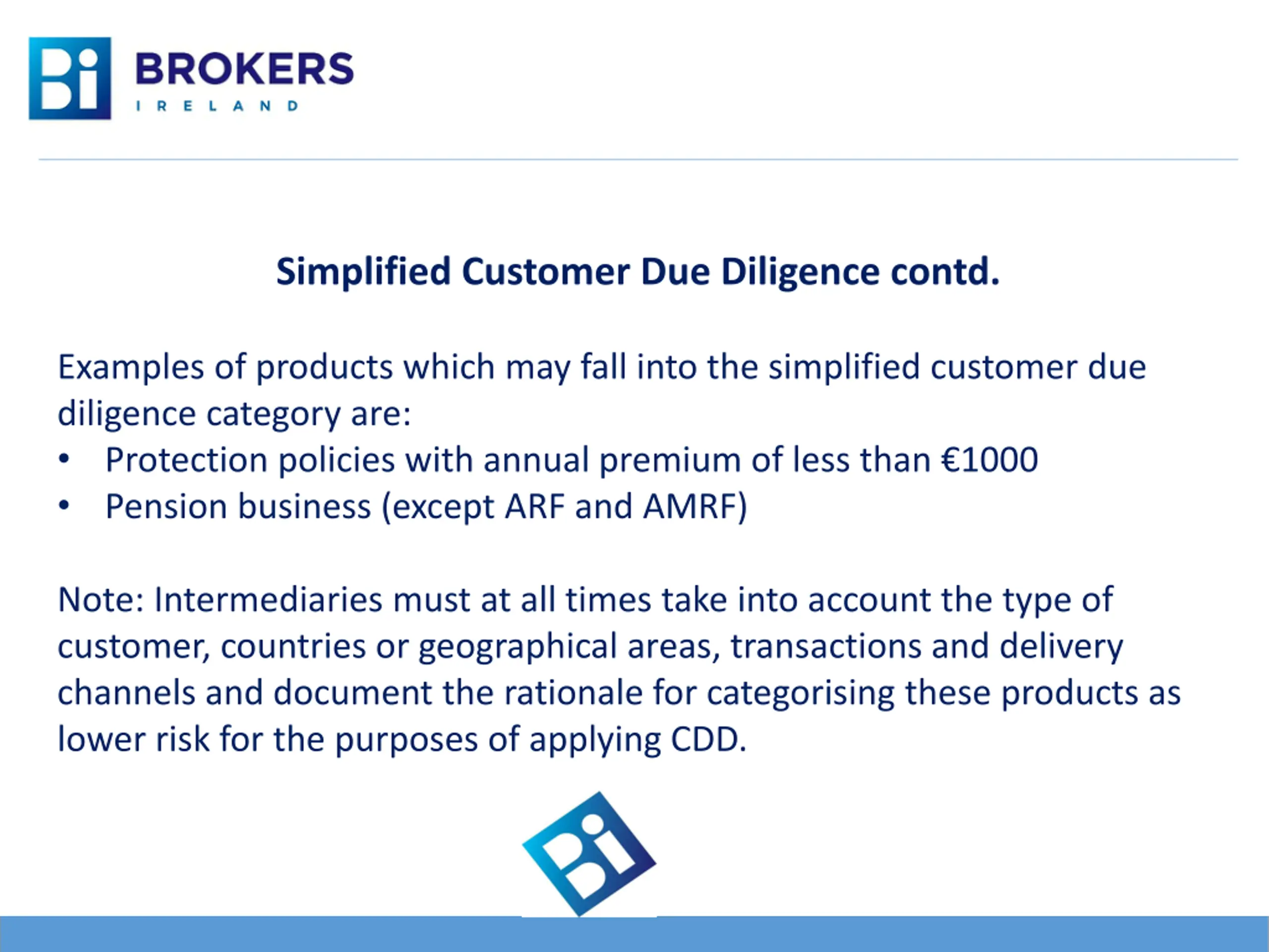 Simplified Customer Due Diligence contd. Examples of products which may fall into the simplified customer due diligence category are: Protection policies with annual premium of less than 1000 Pension business (except ARF and AMRF) Note: Intermediaries must at all times take into account the type of customer, countries or geographical areas, transactions and delivery channels and document the rationale for categorising these products as lower risk for the purposes of applying CDD.