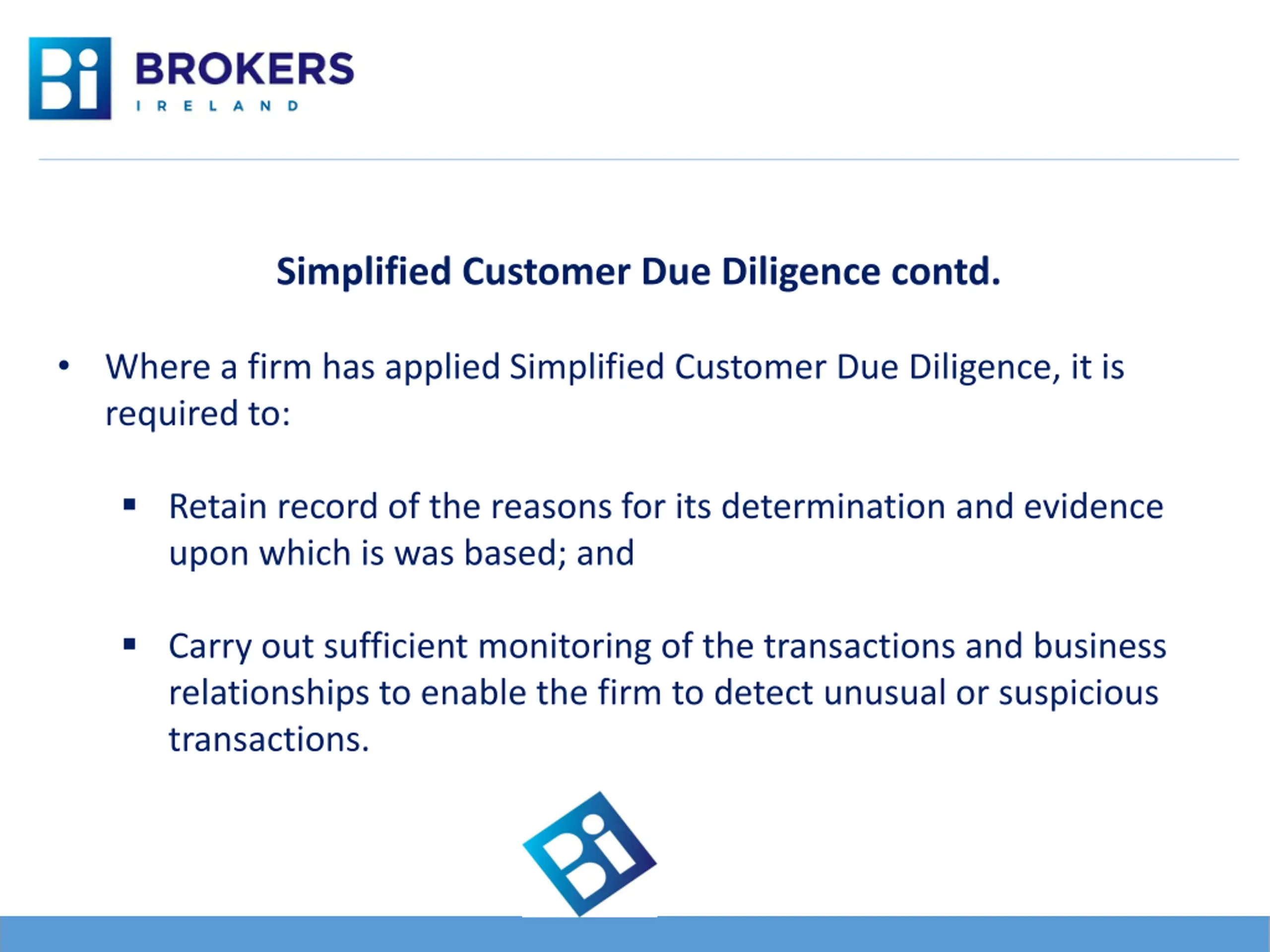 Simplified Customer Due Diligence contd. Where a firm has applied Simplified Customer Due Diligence, it is required to: Retain record of the reasons for its determination and evidence upon which is was based; and Carry out sufficient monitoring of the transactions and business relationships to enable the firm to detect unusual or suspicious transactions.