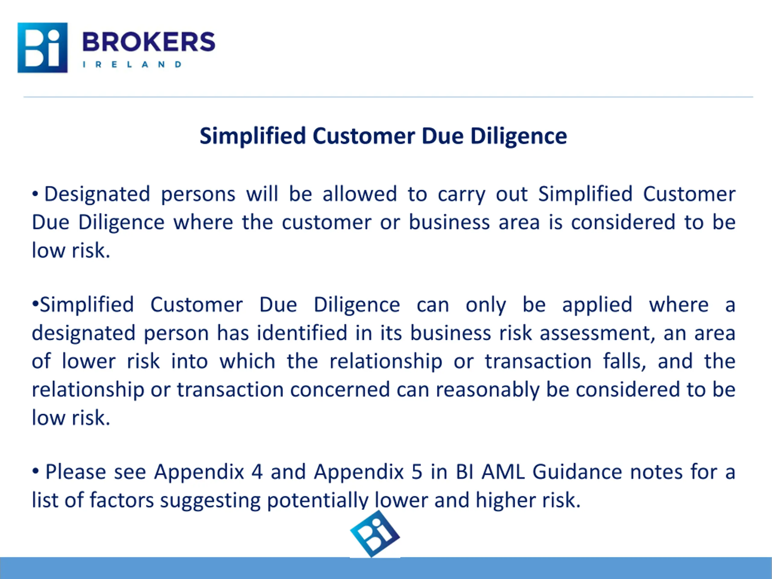 Simplified Customer Due Diligence Designated persons will be allowed to carry out Simplified Customer Due Diligence where the customer or business area is considered to be low risk. Simplified Customer Due Diligence can only be applied where a designated person has identified in its business risk assessment, an area of lower risk into which the relationship or transaction falls, and the relationship or transaction concerned can reasonably be considered to be low risk. Please see Appendix 4 and Appendix 5 in BI AML Guidance notes for a list of factors suggesting potentially lower and higher risk.