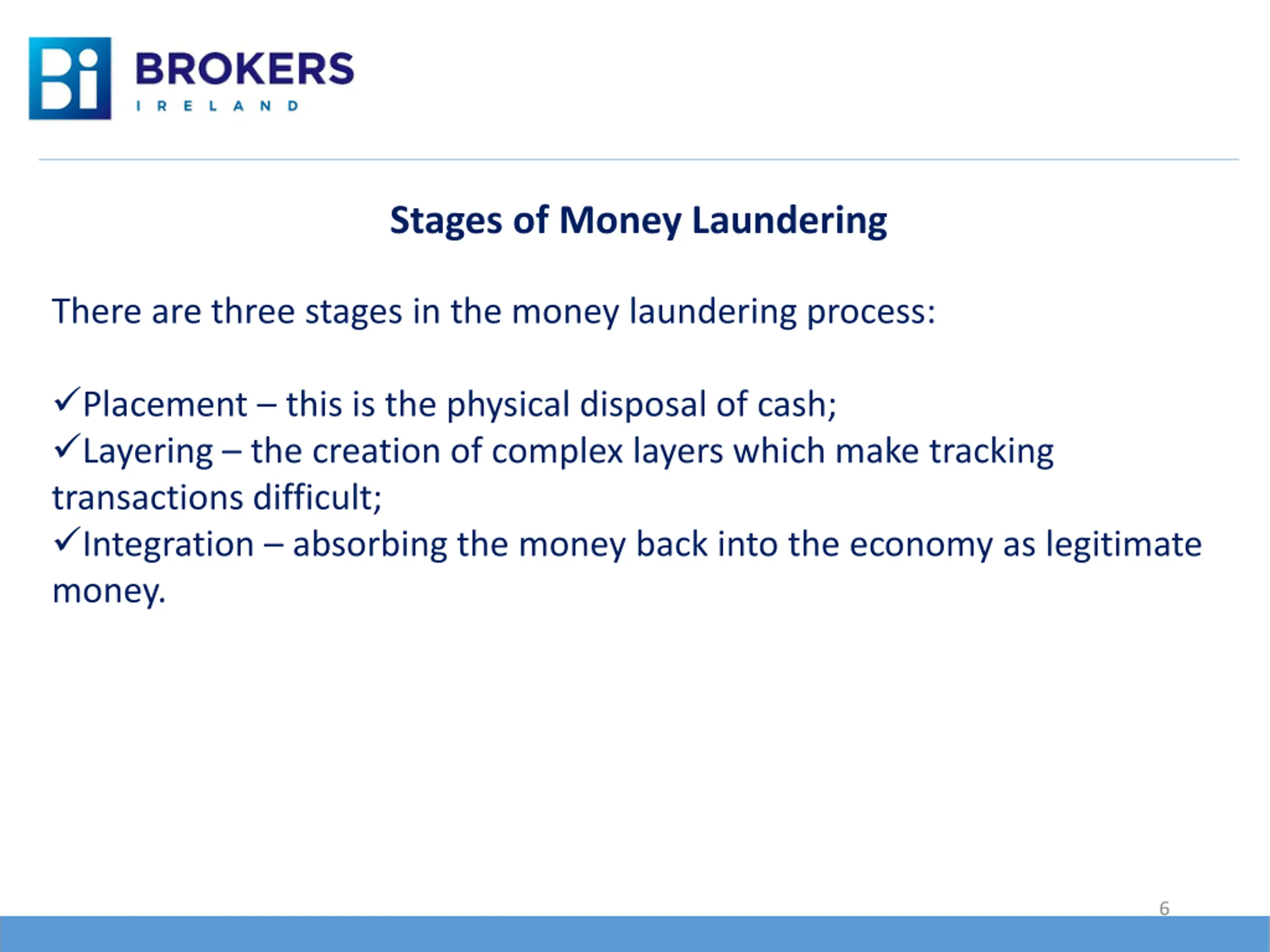Stages of Money Laundering There are three stages in the money laundering process: Placement this is the physical disposal of cash; Layering the creation of complex layers which make tracking transactions difficult; Integration absorbing the money back into the economy as legitimate money. 6