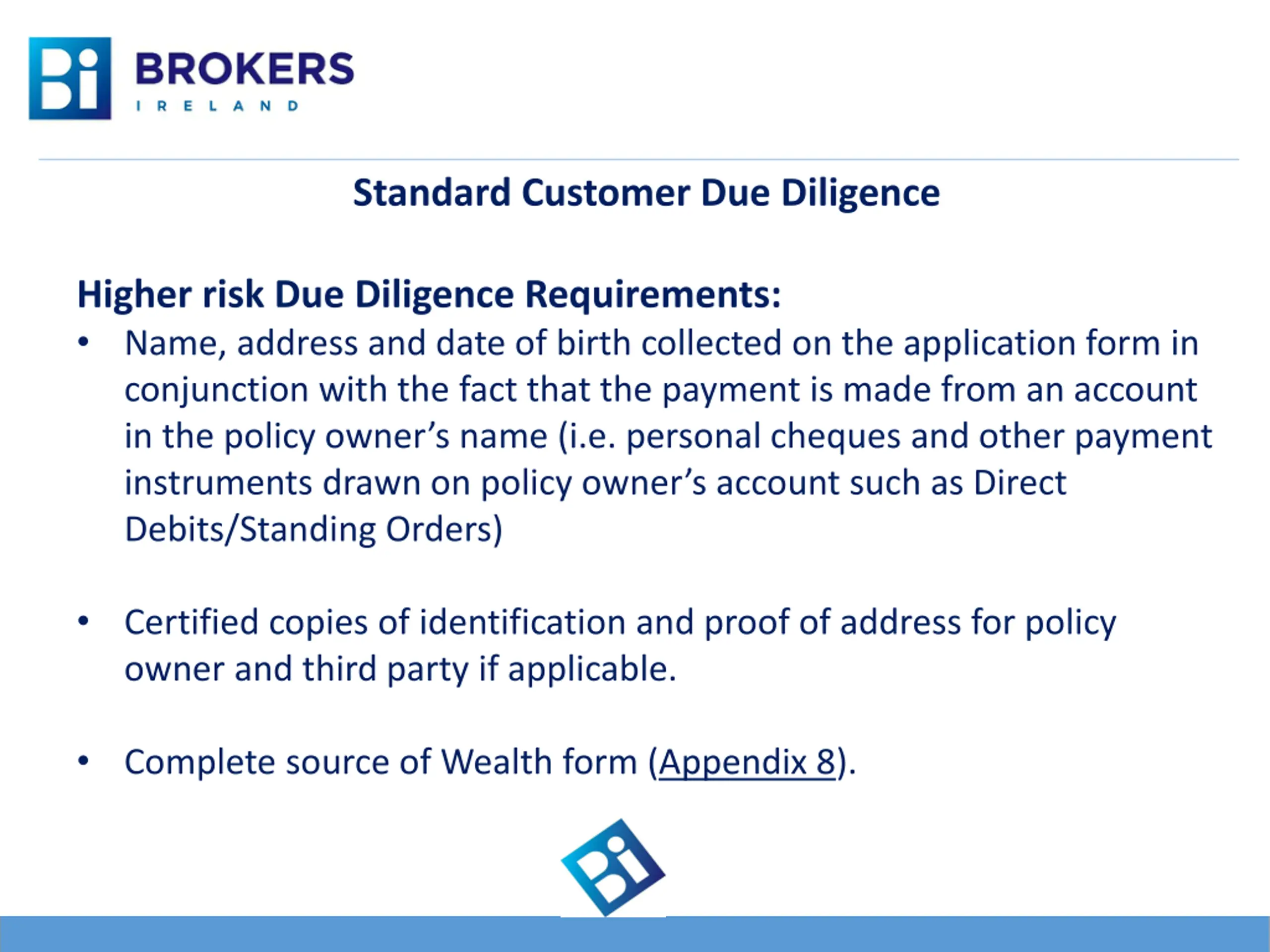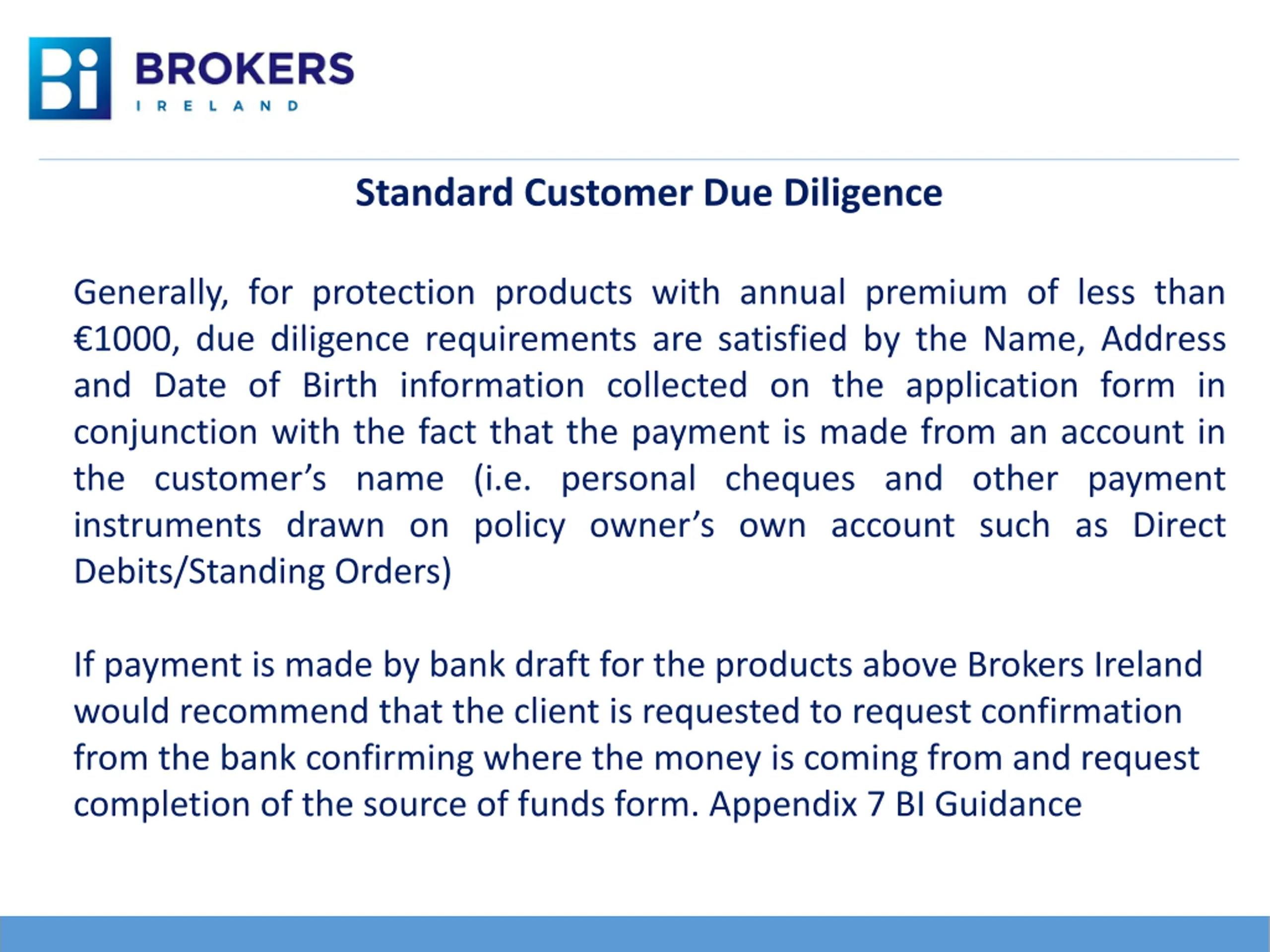Standard Customer Due Diligence Generally, for protection products with annual premium of less than 1000, due diligence requirements are satisfied by the Name, Address and Date of Birth information collected on the application form in conjunction with the fact that the payment is made from an account in the customer s name (i.e. personal cheques and other payment instruments drawn on policy owner s own account such as Direct Debits/Standing Orders) If payment is made by bank draft for the products above Brokers Ireland would recommend that the client is requested to request confirmation from the bank confirming where the money is coming from and request completion of the source of funds form. Appendix 7 BI Guidance