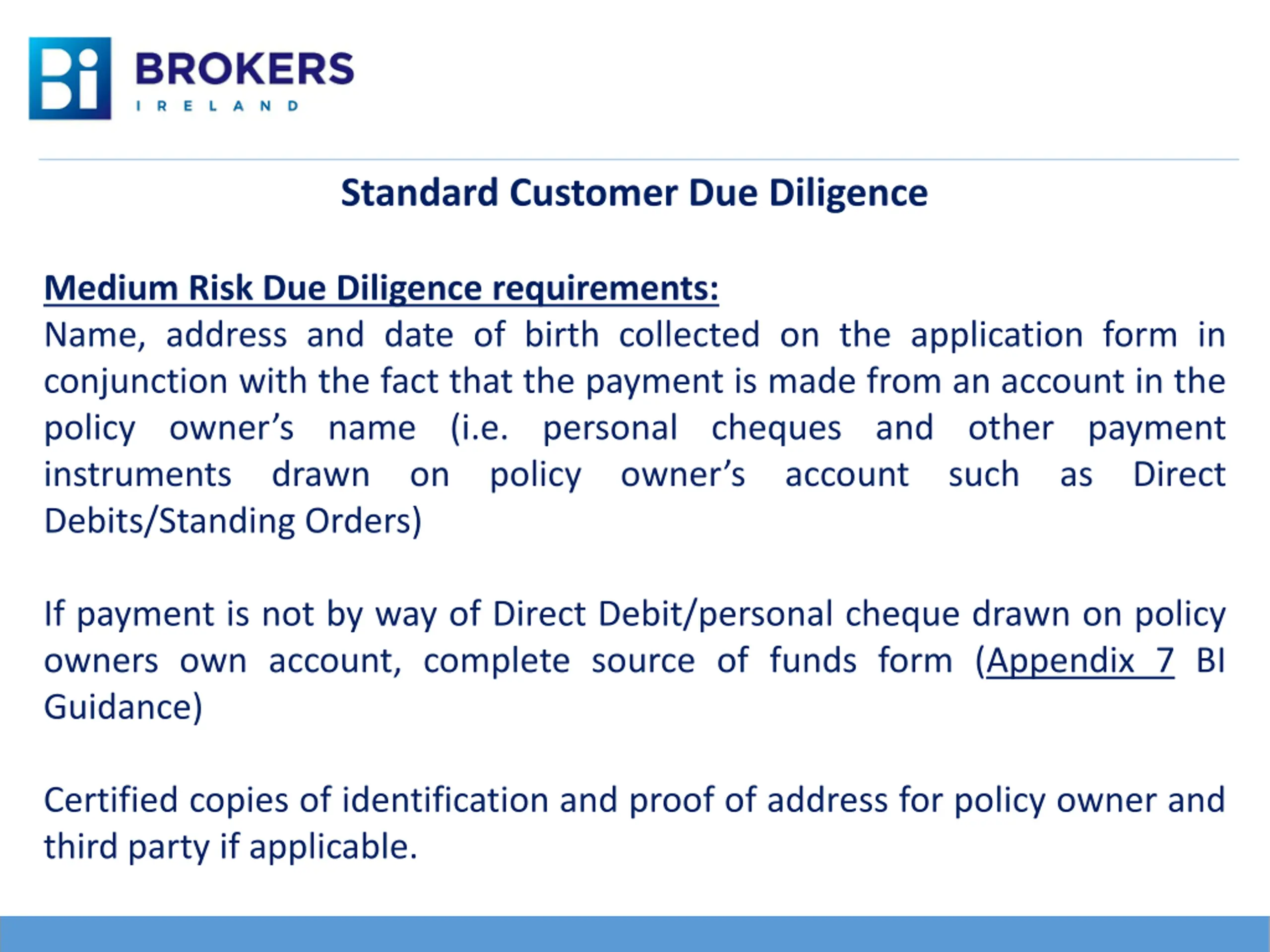 Standard Customer Due Diligence Medium Risk Due Diligence requirements: Name, address and date of birth collected on the application form in conjunction with the fact that the payment is made from an account in the policy owner s name (i.e. personal cheques and other payment instruments drawn on policy owner s account such as Direct Debits/Standing Orders) If payment is not by way of Direct Debit/personal cheque drawn on policy owners own account, complete source of funds form (Appendix 7 BI Guidance) Certified copies of identification and proof of address for policy owner and third party if applicable.