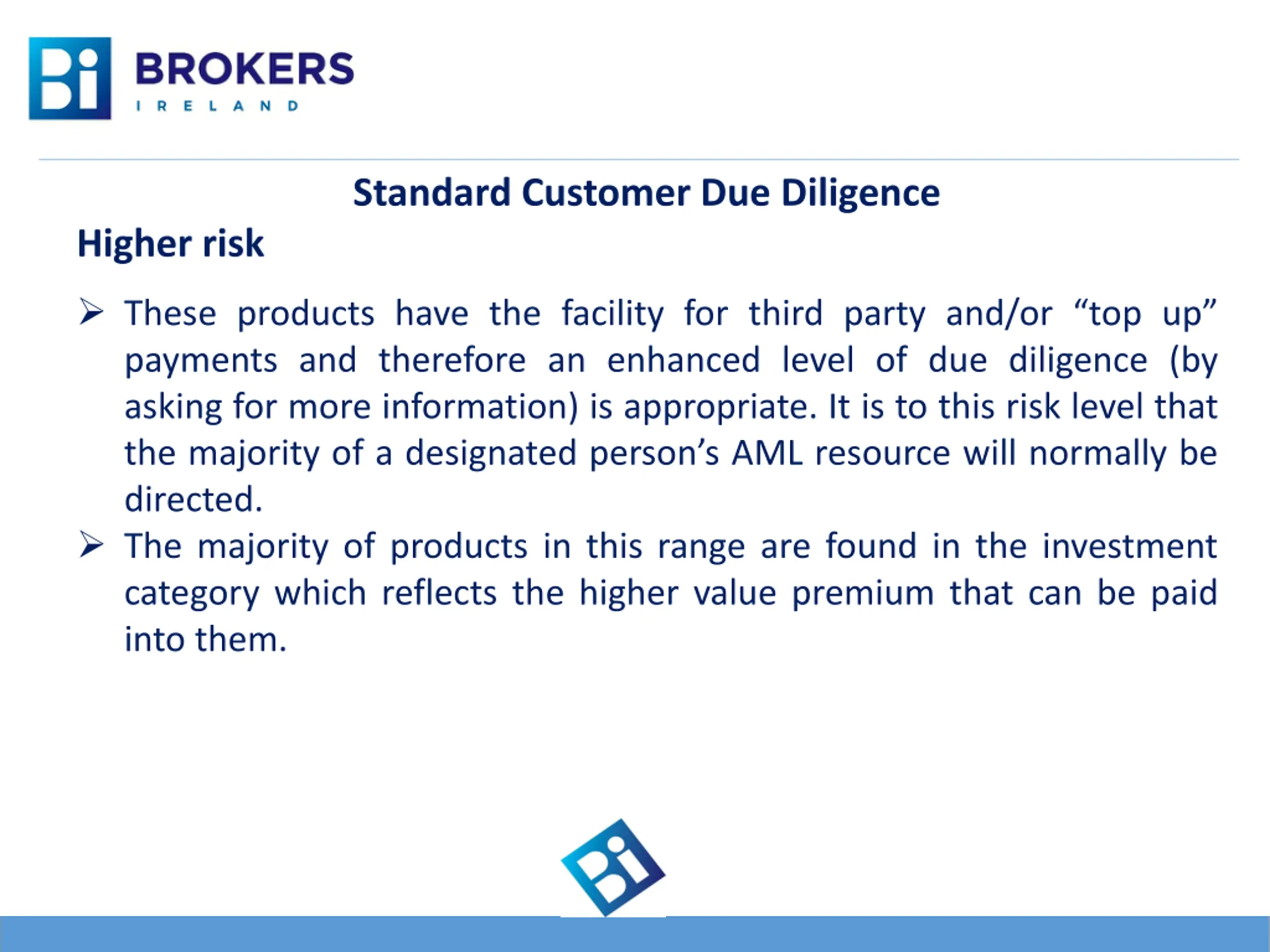 Standard Customer Due Diligence Higher risk These products have the facility for third party and/or topup payments and therefore an enhanced level of due diligence (by asking for more information) is appropriate. It is to this risk level that the majority of a designated person s AML resource will normally be directed. The majority of products in this range are found in the investment category which reflects the higher value premium that can be paid into them.