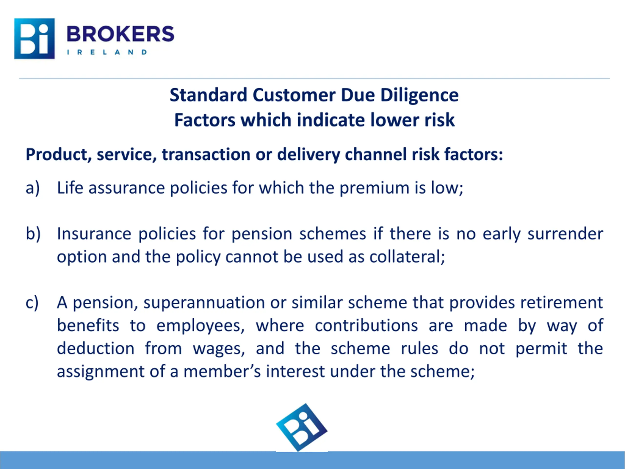 Standard Customer Due Diligence Factors which indicate lower risk Product, service, transaction or delivery channel risk factors: a) Life assurance policies for which the premium is low; b) Insurance policies for pension schemes if there is no early surrender option and the policy cannot be used as collateral; c) A pension, superannuation or similar scheme that provides retirement benefits to employees, where contributions are made by way of deduction from wages, and the scheme rules do not permit the assignment of a member s interest under the scheme;