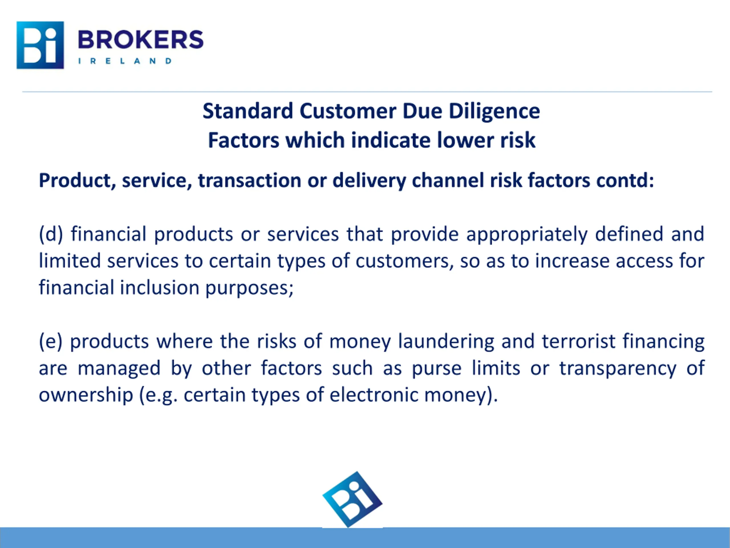 Standard Customer Due Diligence Factors which indicate lower risk Product, service, transaction or delivery channel risk factors contd: (d) financial products or services that provide appropriately defined and limited services to certain types of customers, so as to increase access for financial inclusion purposes; (e) products where the risks of money laundering and terrorist financing are managed by other factors such as purse limits or transparency of ownership (e.g. certain types of electronic money).