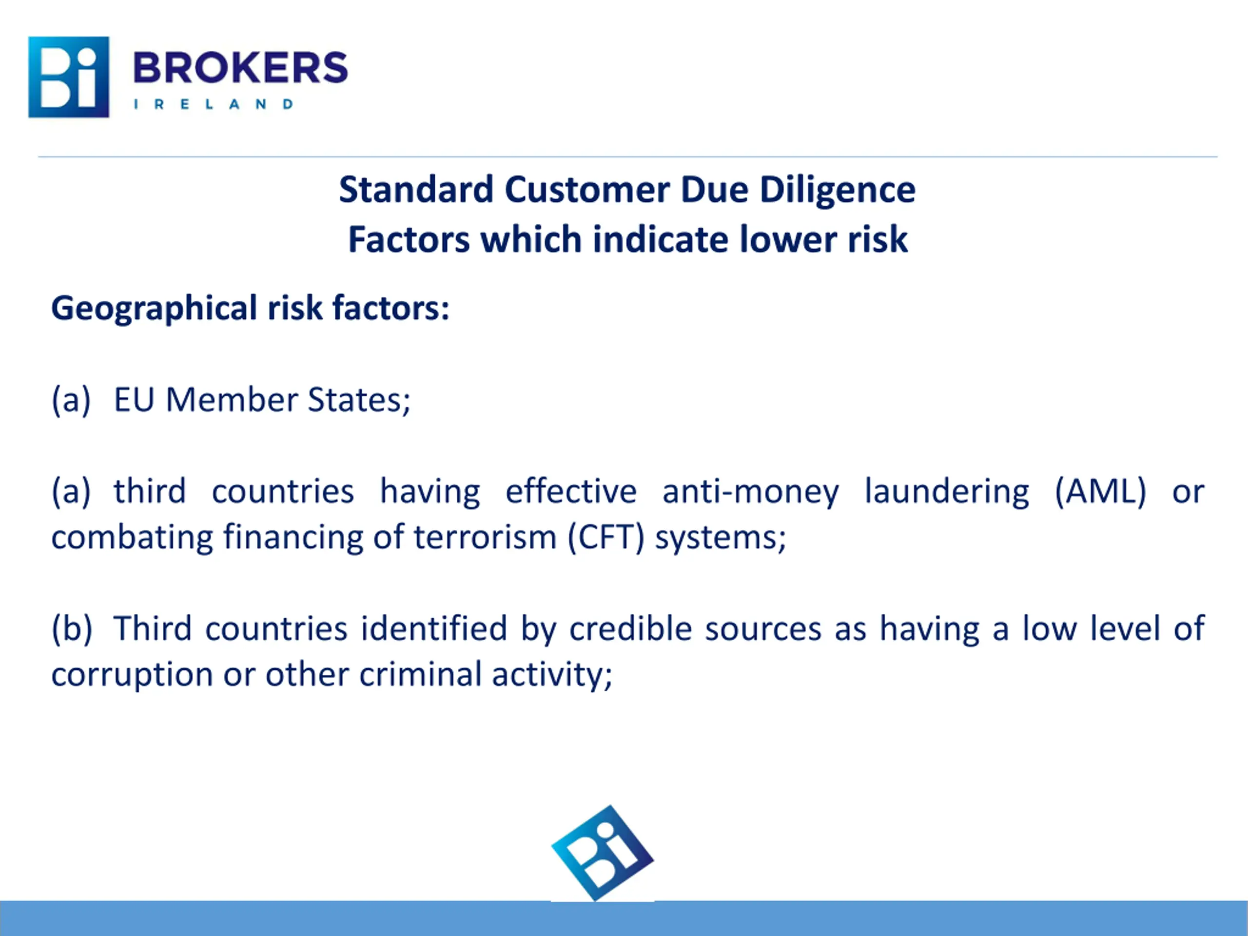 Standard Customer Due Diligence Factors which indicate lower risk Geographical risk factors: (a) EU Member States; (a) third countries having effective anti-money laundering (AML) or combating financing of terrorism (CFT) systems; (b) Third countries identified by credible sources as having a low level of corruption or other criminal activity;