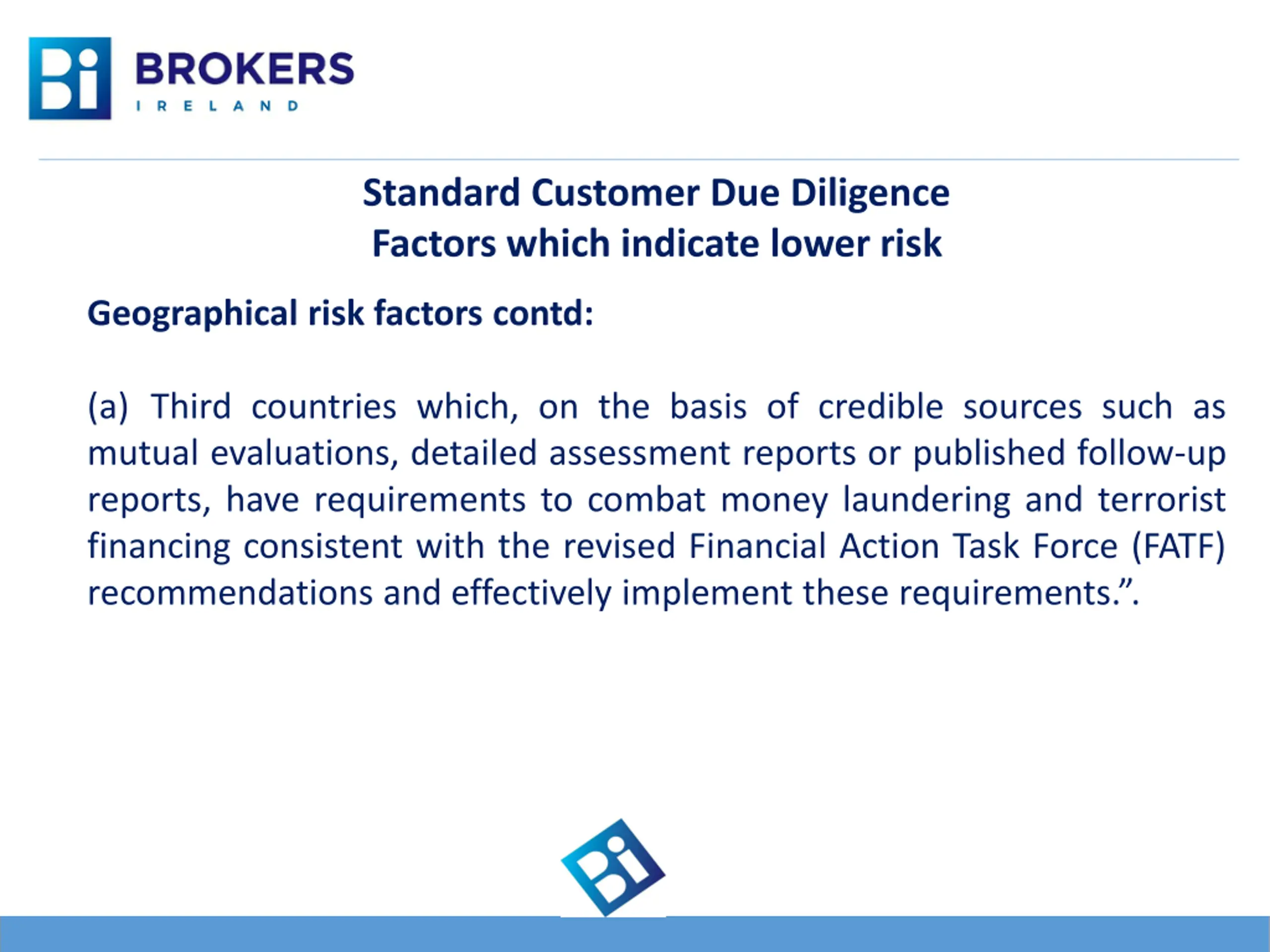 Standard Customer Due Diligence Factors which indicate lower risk Geographical risk factors contd: (a) Third countries which, on the basis of credible sources such as mutual evaluations, detailed assessment reports or published follow-up reports, have requirements to combat money laundering and terrorist financing consistent with the revised Financial Action Task Force (FATF) recommendations and effectively implement these requirements. .