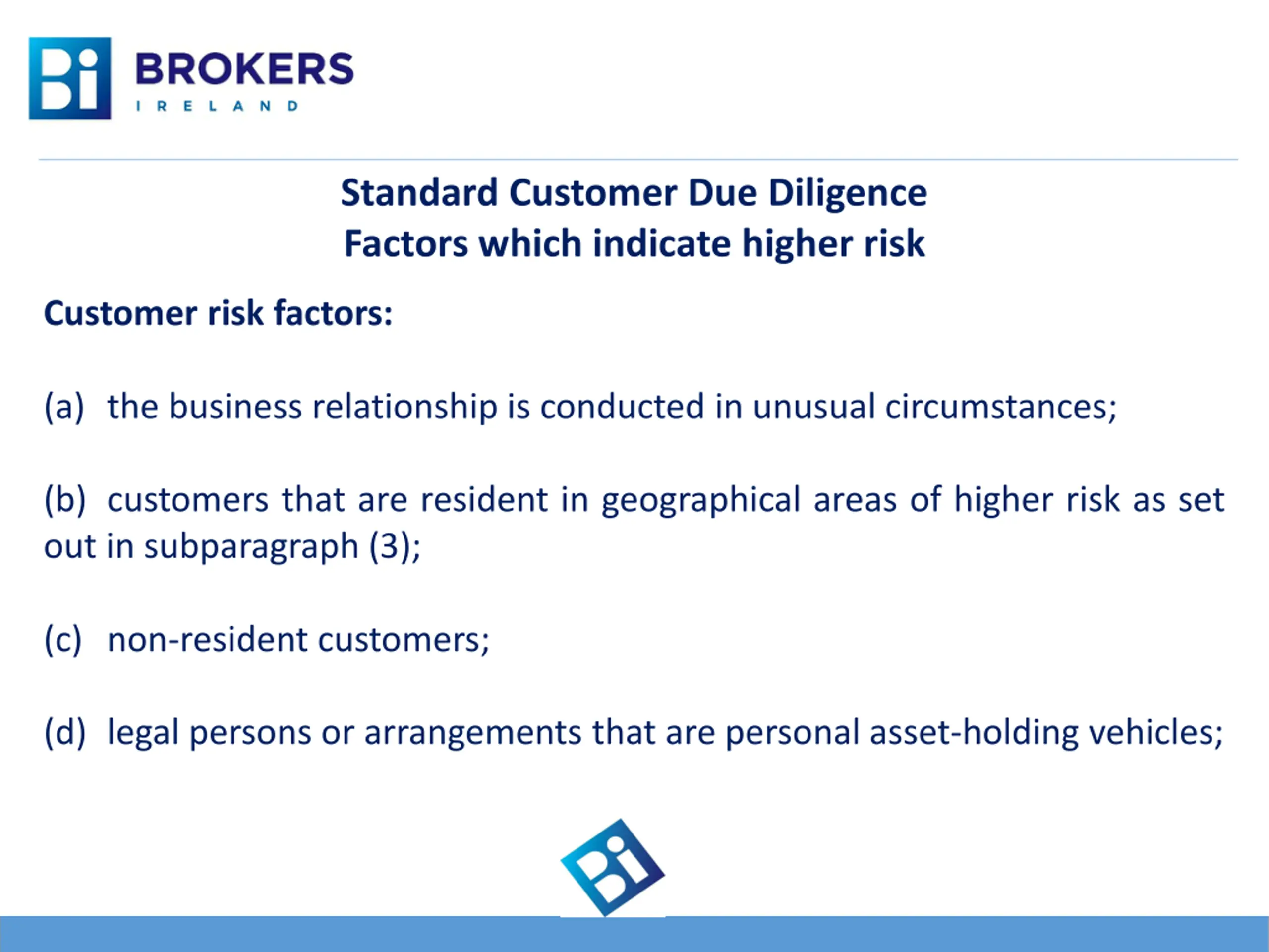 Standard Customer Due Diligence Factors which indicate higher risk Customer risk factors: (a) the business relationship is conducted in unusual circumstances; (b) customers that are resident in geographical areas of higher risk as set out in subparagraph (3); (c) non-resident customers; (d) legal persons or arrangements that are personal asset-holding vehicles;