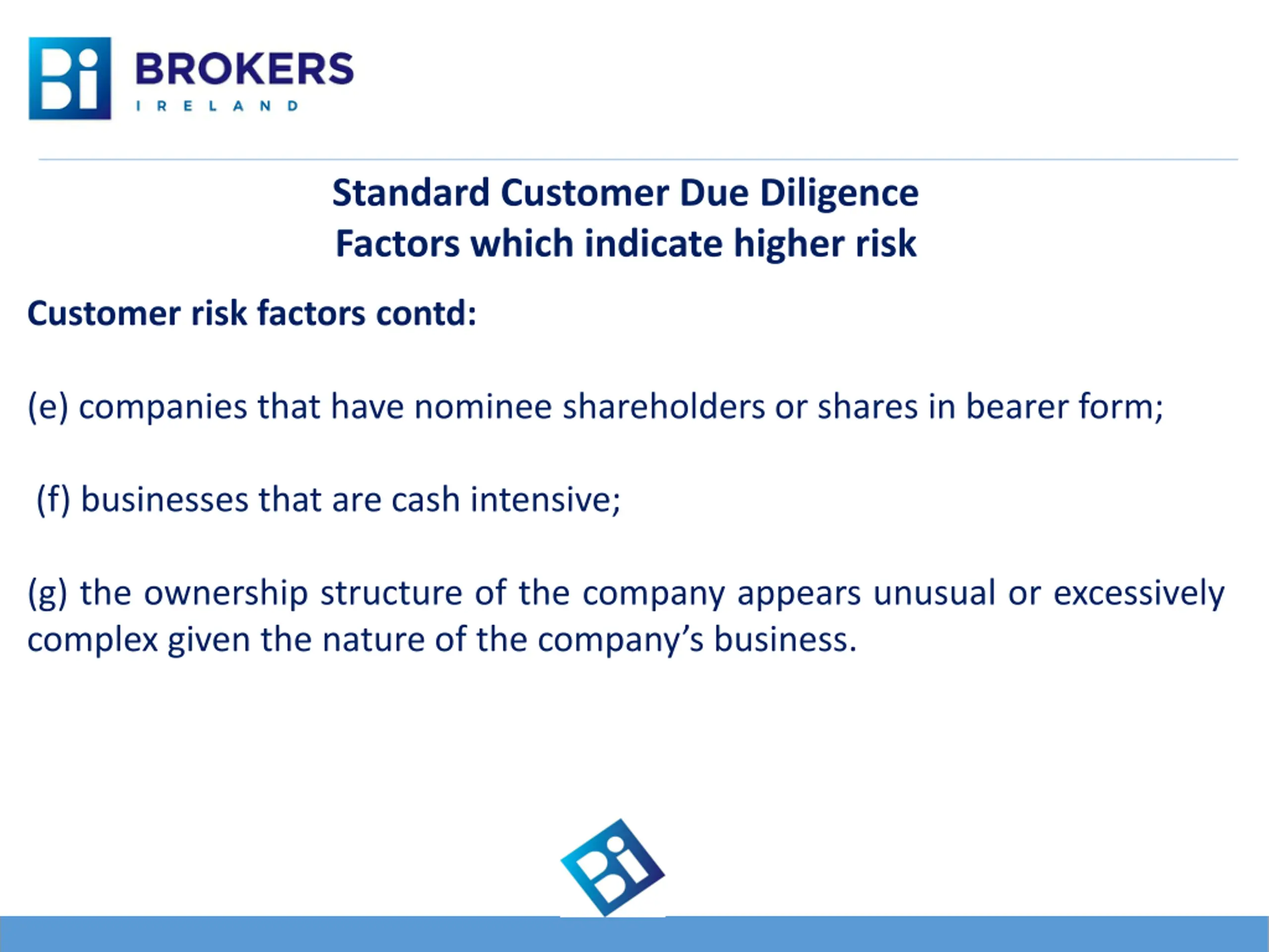 Standard Customer Due Diligence Factors which indicate higher risk Customer risk factors contd: (e) companies that have nominee shareholders or shares in bearer form; (f) businesses that are cash intensive; (g) the ownership structure of the company appears unusual or excessively complex given the nature of the company s business.