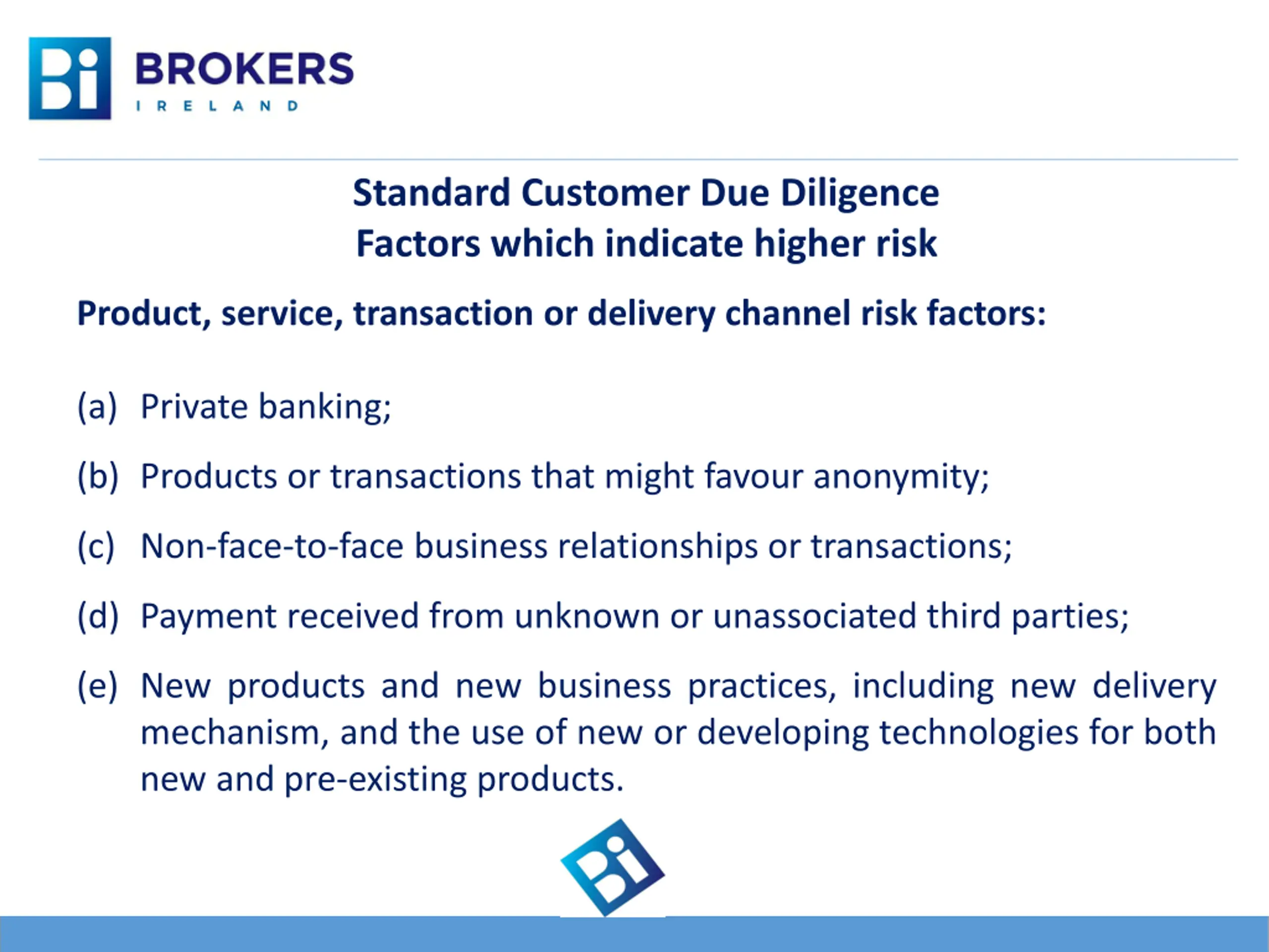 Standard Customer Due Diligence Factors which indicate higher risk Product, service, transaction or delivery channel risk factors: (a) Private banking; (b) Products or transactions that might favour anonymity; (c) Non-face-to-face business relationships or transactions; (d) Payment received from unknown or unassociated third parties; (e) New products and new business practices, including new delivery mechanism, and the use of new or developing technologies for both new and pre-existing products.