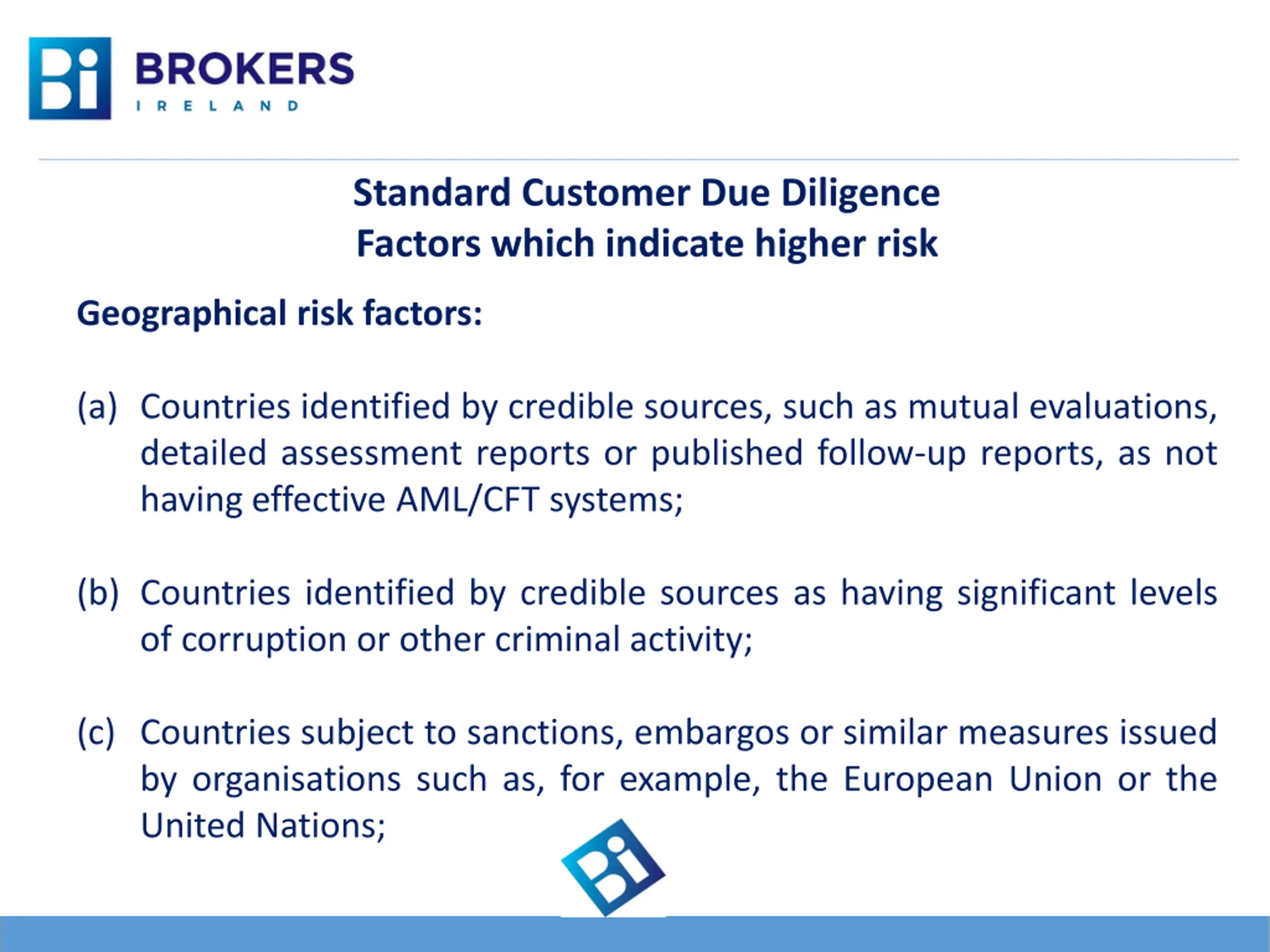 Standard Customer Due Diligence Factors which indicate higher risk Geographical risk factors: (a) Countries identified by credible sources, such as mutual evaluations, detailed assessment reports or published follow-up reports, as not having effective AML/CFT systems; (b) Countries identified by credible sources as having significant levels of corruption or other criminal activity; (c) Countries subject to sanctions, embargos or similar measures issued by organisations such as, for example, the European Union or the United Nations;