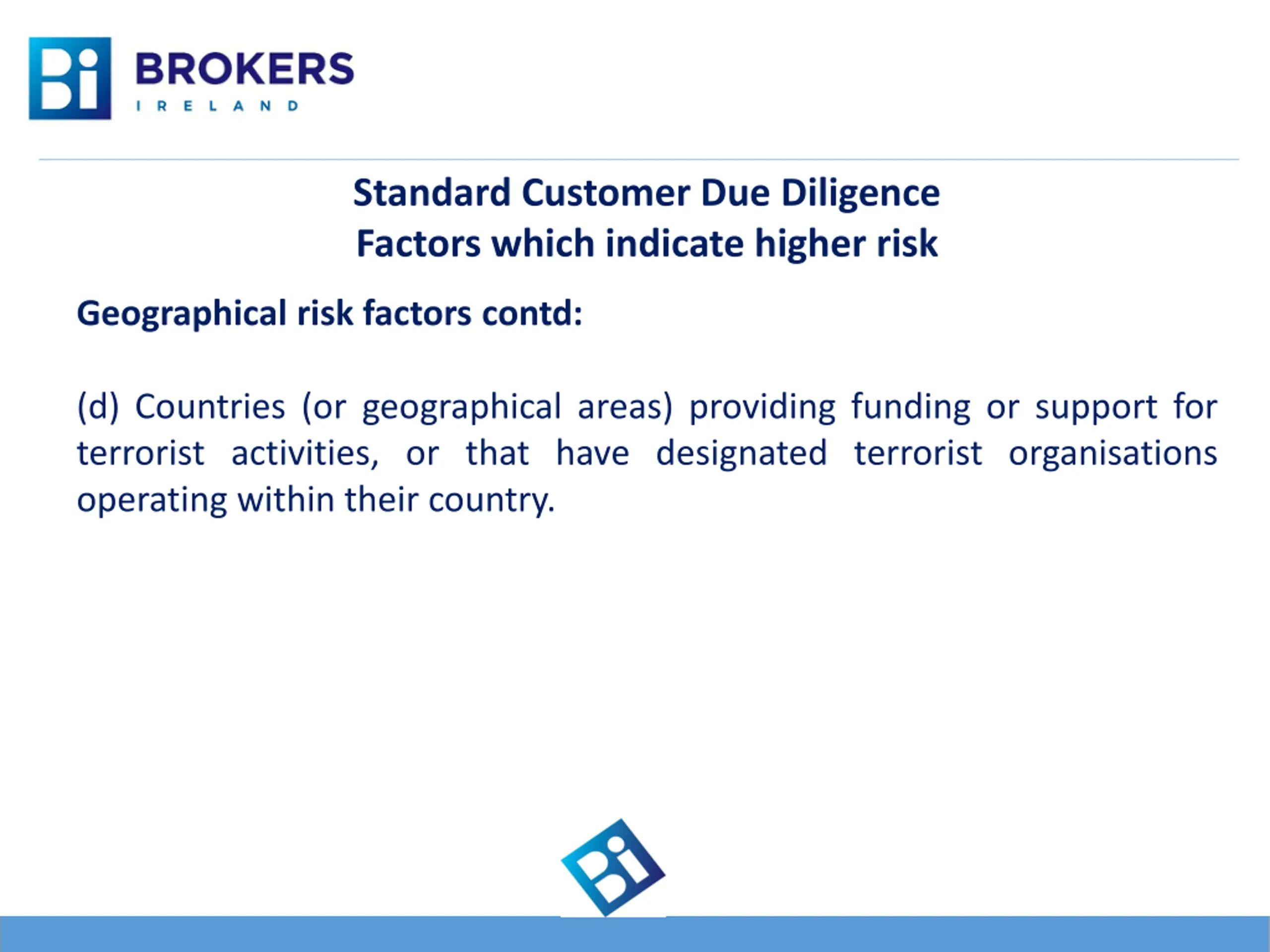 Standard Customer Due Diligence Factors which indicate higher risk Geographical risk factors contd: (d) Countries (or geographical areas) providing funding or support for terrorist activities, or that have designated terrorist organisations operating within their country.