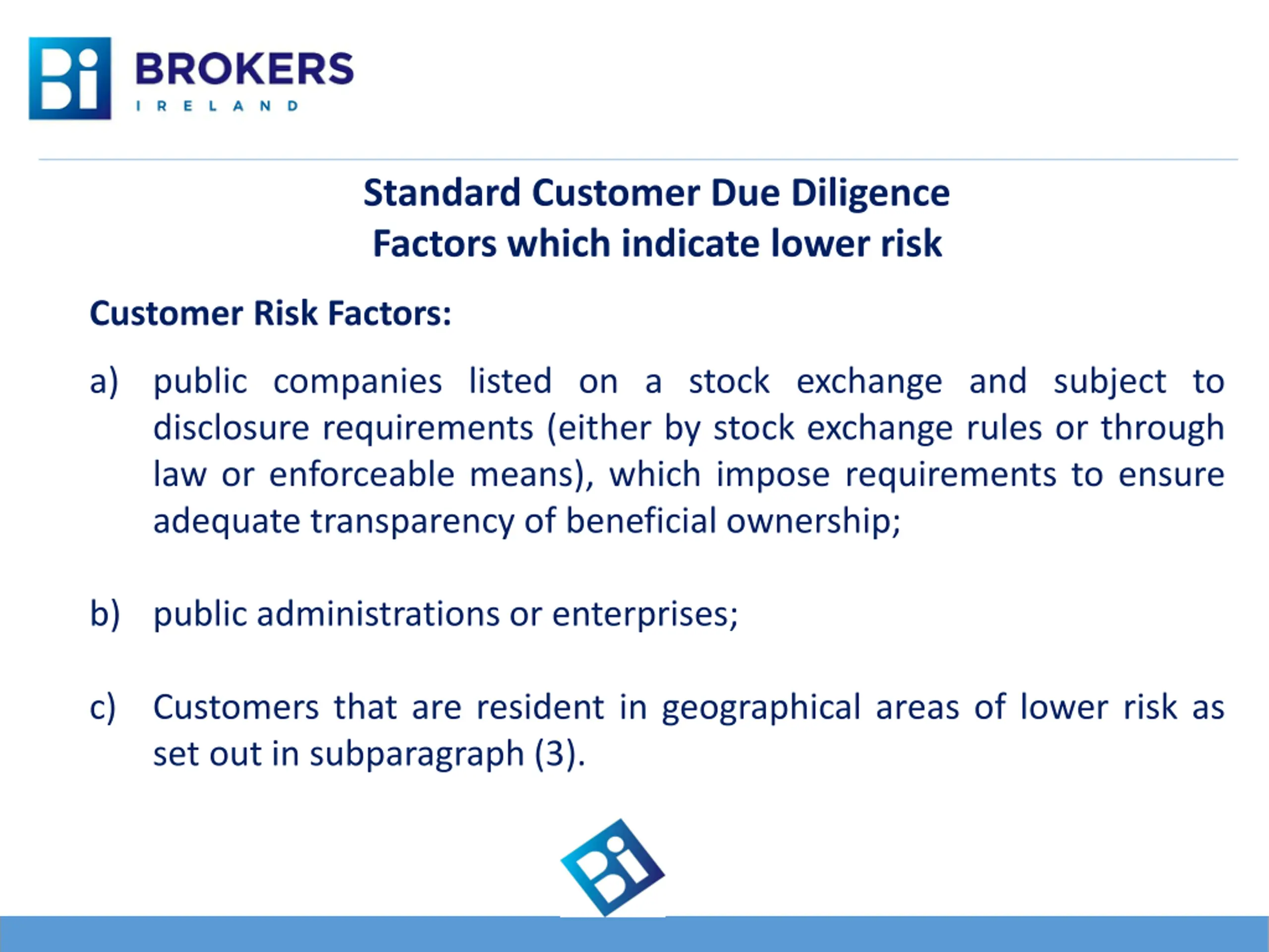 Standard Customer Due Diligence Factors which indicate lower risk Customer Risk Factors: a) public companies listed on a stock exchange and subject to disclosure requirements (either by stock exchange rules or through law or enforceable means), which impose requirements to ensure adequate transparency of beneficial ownership; b) public administrations or enterprises; c) Customers that are resident in geographical areas of lower risk as set out in subparagraph (3).