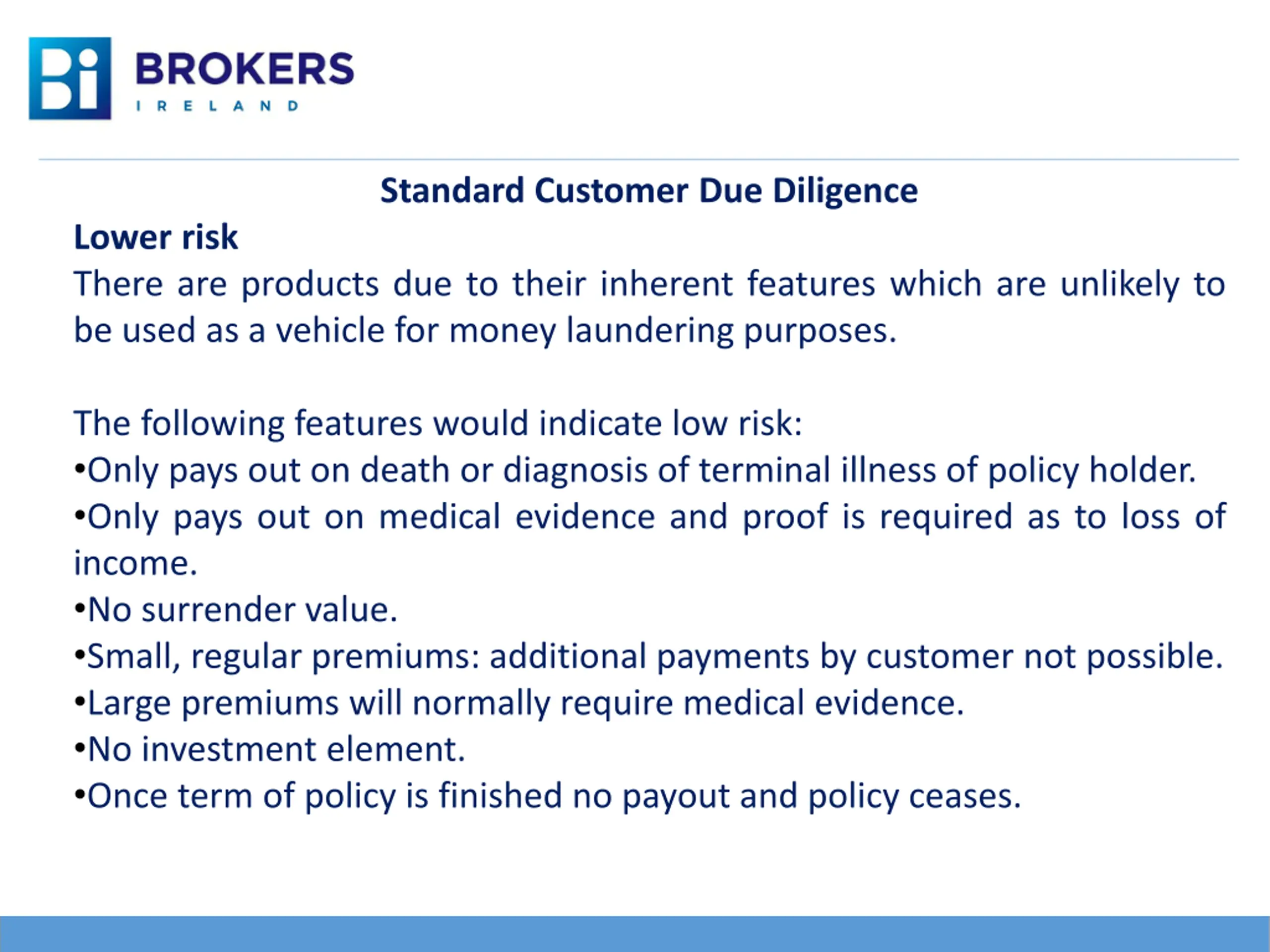 Standard Customer Due Diligence Lower risk There are products due to their inherent features which are unlikely to be used as a vehicle for money laundering purposes. The following features would indicate low risk: Only pays out on death or diagnosis of terminal illness of policy holder. Only pays out on medical evidence and proof is required as to loss of income. No surrender value. Small, regular premiums: additional payments by customer not possible. Large premiums will normally require medical evidence. No investment element. Once term of policy is finished no payout and policy ceases.