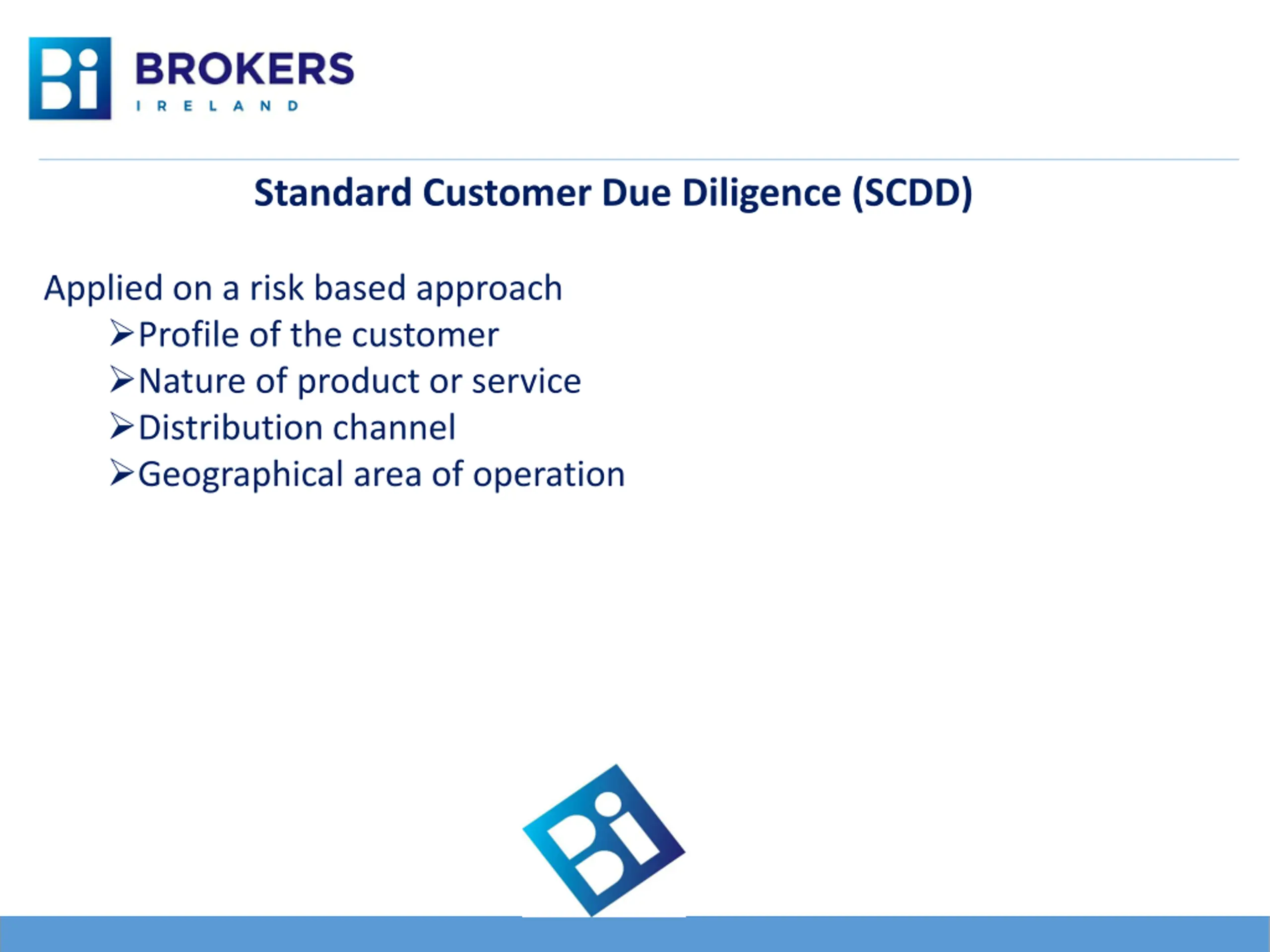 Standard Customer Due Diligence (SCDD) Applied on a risk based approach Profile of the customer Nature of product or service Distribution channel Geographical area of operation