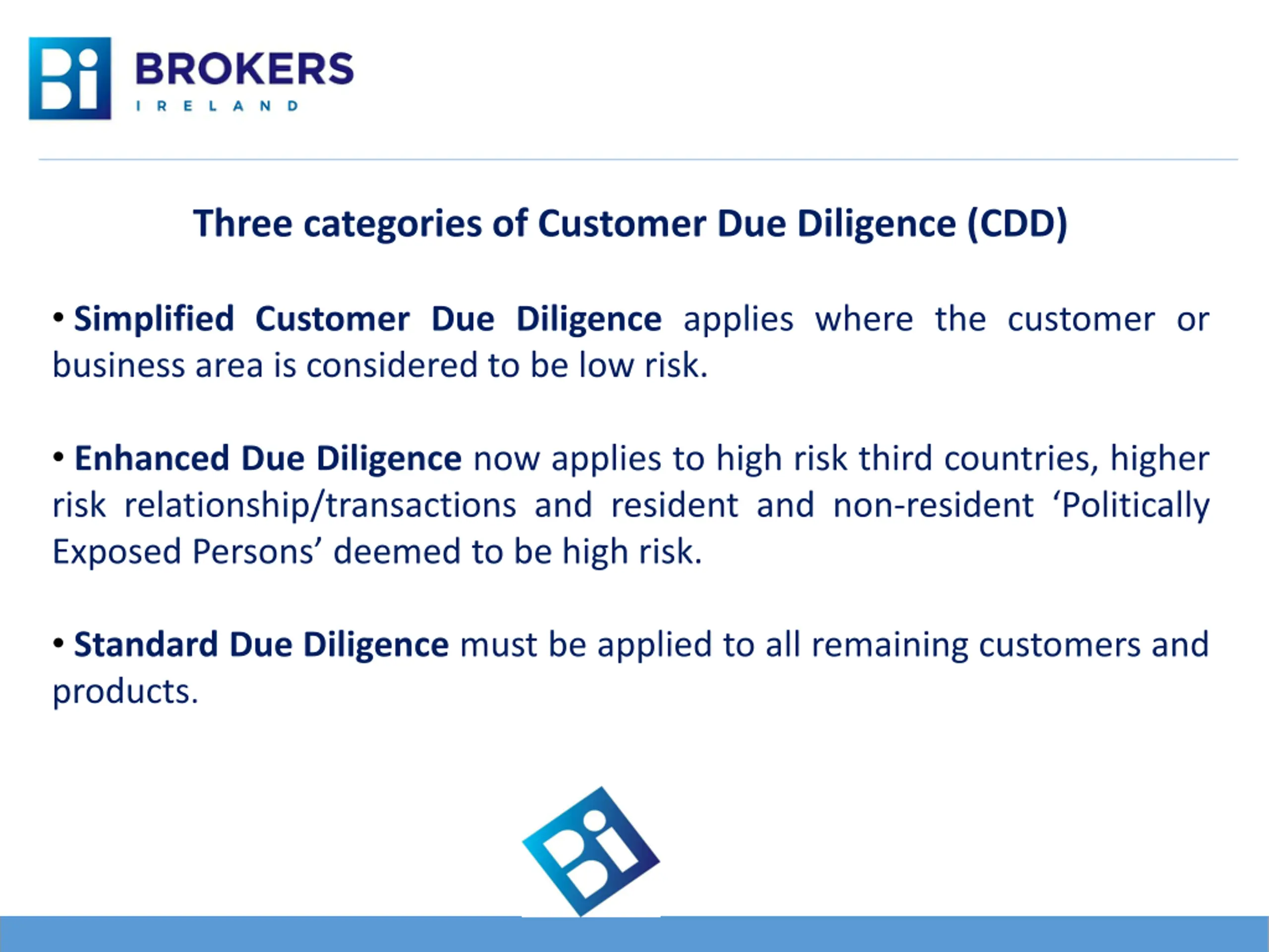 Three categories of Customer Due Diligence (CDD) Simplified Customer Due Diligence applies where the customer or business area is considered to be low risk. Enhanced Due Diligence now applies to high risk third countries, higher risk relationship/transactions and resident and non-resident Politically Exposed Persons deemed to be high risk. Standard Due Diligence must be applied to all remaining customers and products.