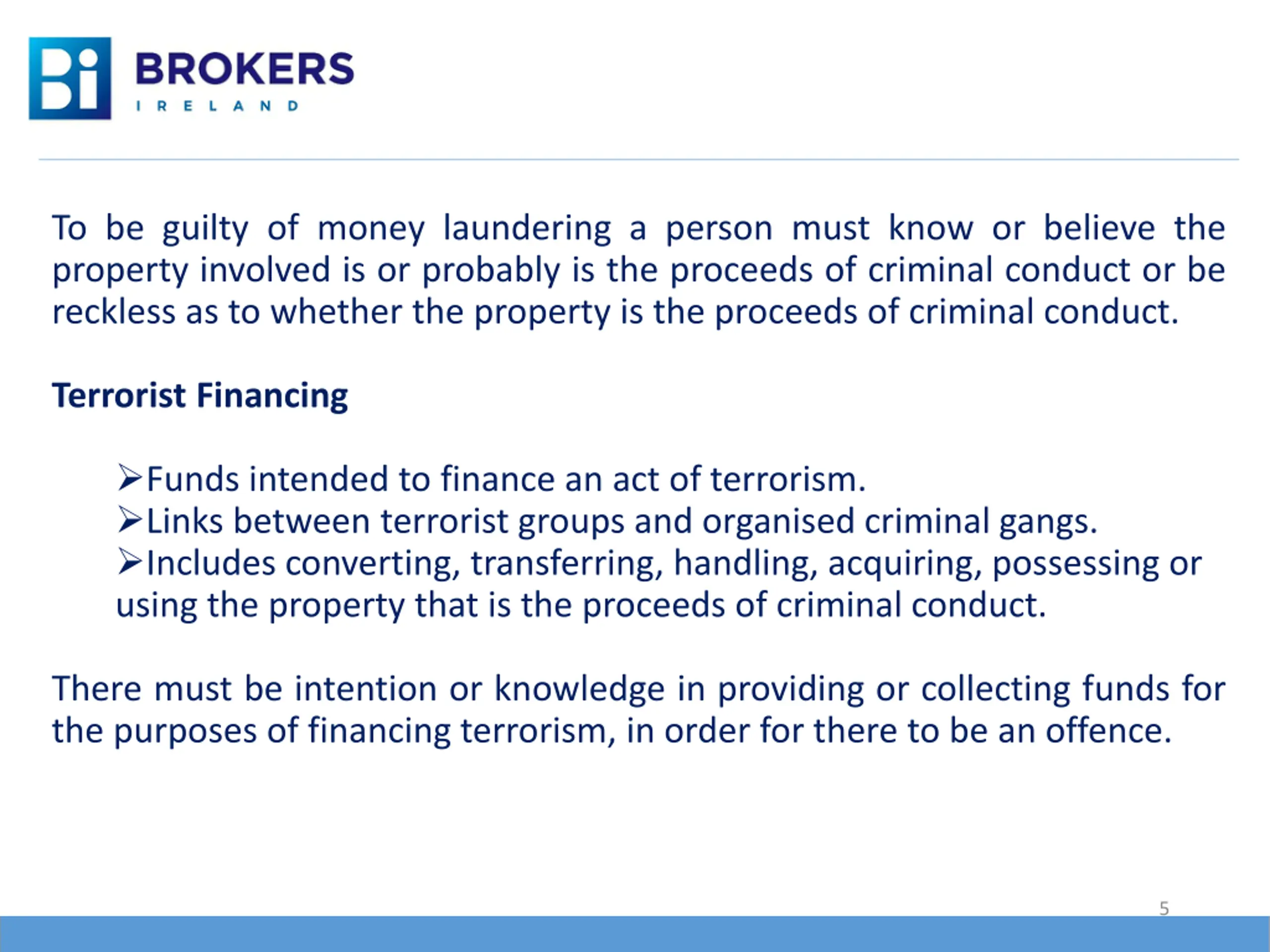 To be guilty of money laundering a person must know or believe the property involved is or probably is the proceeds of criminal conduct or be reckless as to whether the property is the proceeds of criminal conduct. Terrorist Financing Funds intended to finance an act of terrorism. Links between terrorist groups and organised criminal gangs. Includes converting, transferring, handling, acquiring, possessing or using the property that is the proceeds of criminal conduct. There must be intention or knowledge in providing or collecting funds for the purposes of financing terrorism, in order for there to be an offence. 5