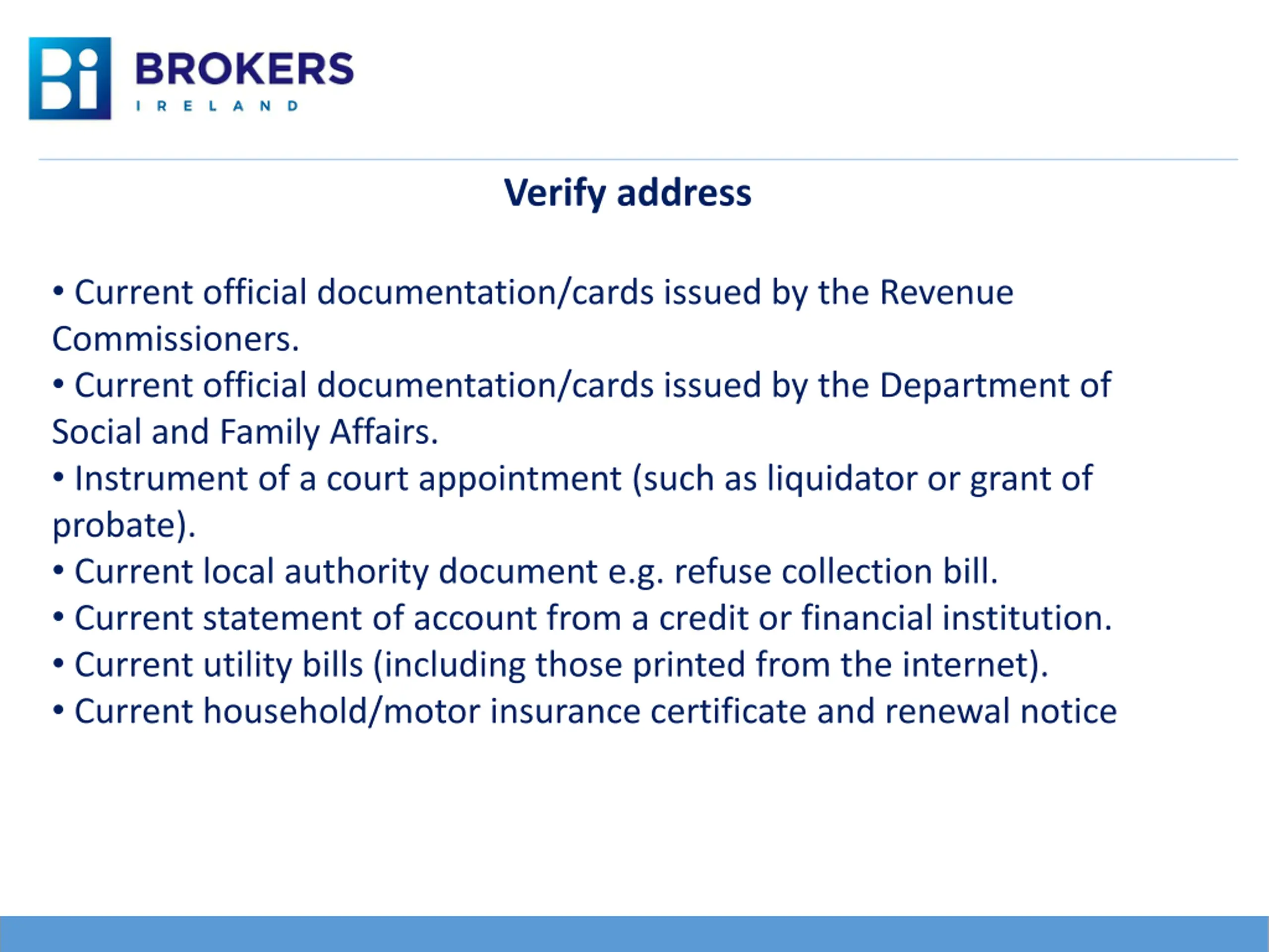 Verify address Current official documentation/cards issued by the Revenue Commissioners. Current official documentation/cards issued by the Department of Social and Family Affairs. Instrument of a court appointment (such as liquidator or grant of probate). Current local authority document e.g. refuse collection bill. Current statement of account from a credit or financial institution. Current utility bills (including those printed from the internet). Current household/motor insurance certificate and renewal notice