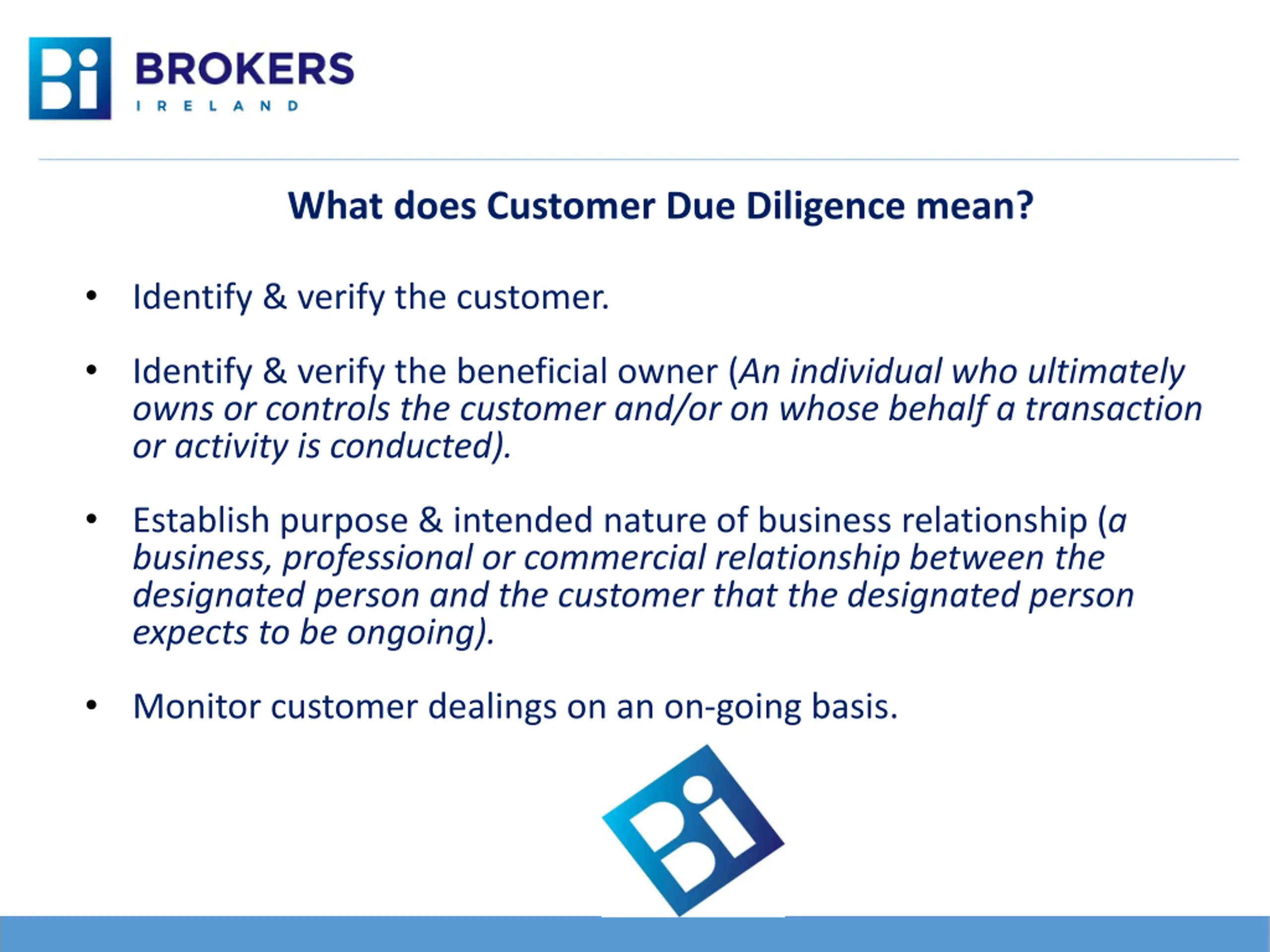 What does Customer Due Diligence mean? Identify & verify the customer. Identify & verify the beneficial owner (An individual who ultimately owns or controls the customer and/or on whose behalf a transaction or activity is conducted). Establish purpose & intended nature of business relationship (a business, professional or commercial relationship between the designated person and the customer that the designated person expects to be ongoing). Monitor customer dealings on an on-going basis.