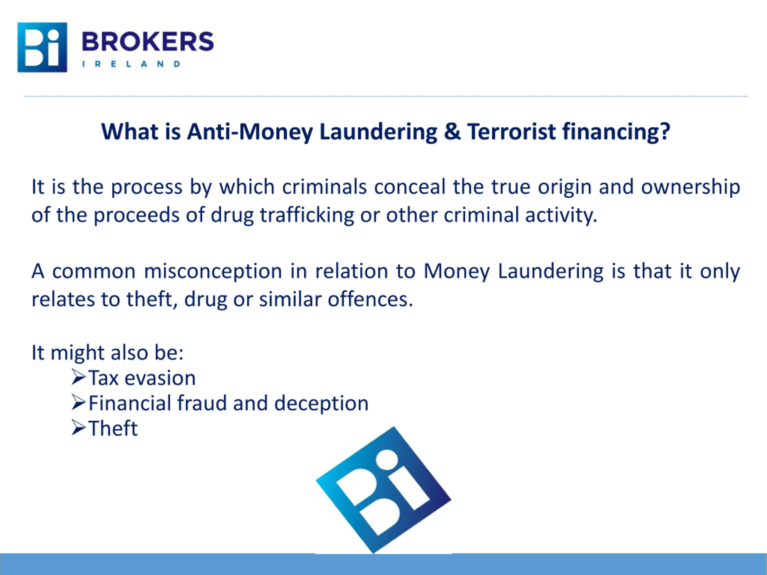 What is Anti-Money Laundering & Terrorist financing? It is the process by which criminals conceal the true origin and ownership of the proceeds of drug trafficking or other criminal activity. A common misconception in relation to Money Laundering is that it only relates to theft, drug or similar offences. It might also be: Tax evasion Financial fraud and deception Theft