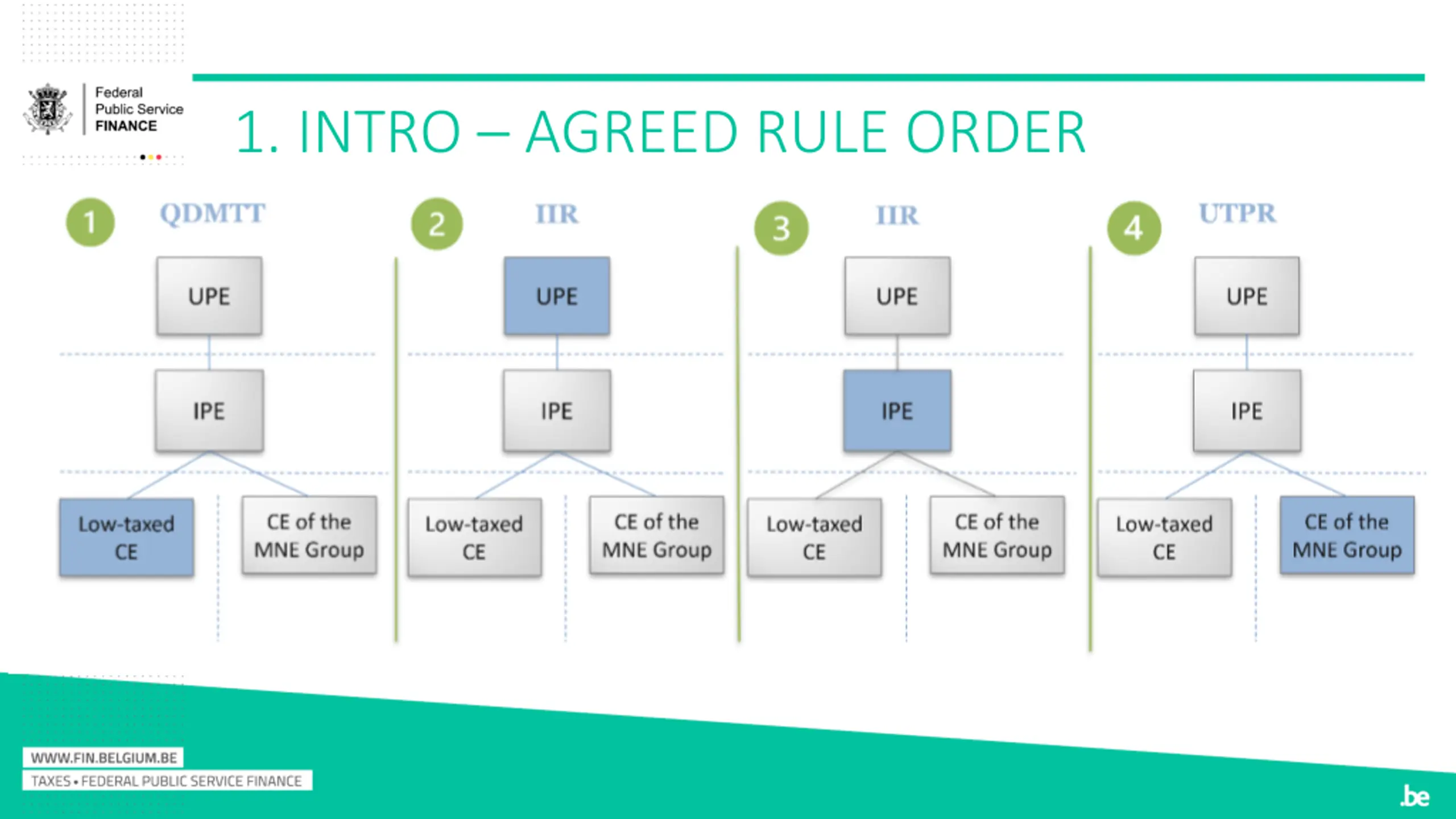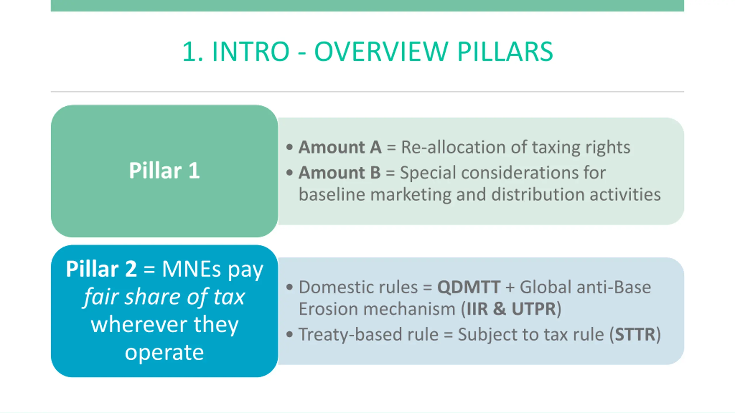 1. INTRO - OVERVIEW PILLARS Amount A = Re-allocation of taxing rights Amount B = Special considerations for baseline marketing and distribution activities Pillar 1 Pillar 2 = MNEs pay fair share of tax wherever they operate Domestic rules = QDMTT + Global anti-Base Erosion mechanism (IIR & UTPR) Treaty-based rule = Subject to tax rule (STTR)