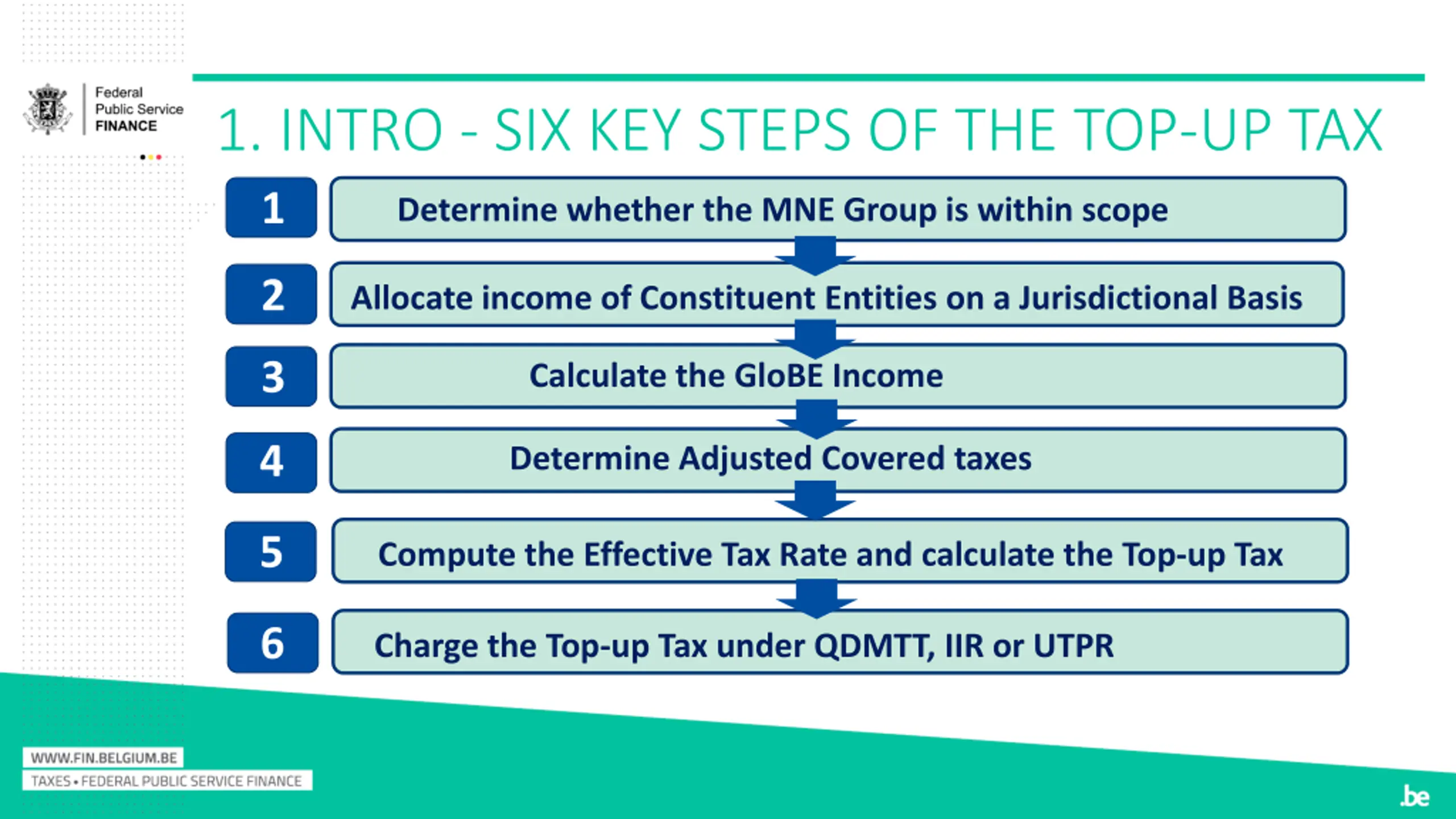 1. INTRO - SIX KEY STEPS OF THE TOP-UP TAX 1 Determine whether the MNE Group is within scope 2 Allocate income of Constituent Entities on a Jurisdictional Basis 3 Calculate the GloBE Income 4 Determine Adjusted Covered taxes 5 Compute the Effective Tax Rate and calculate the Top-up Tax 6 Charge the Top-up Tax under QDMTT, IIR or UTPR