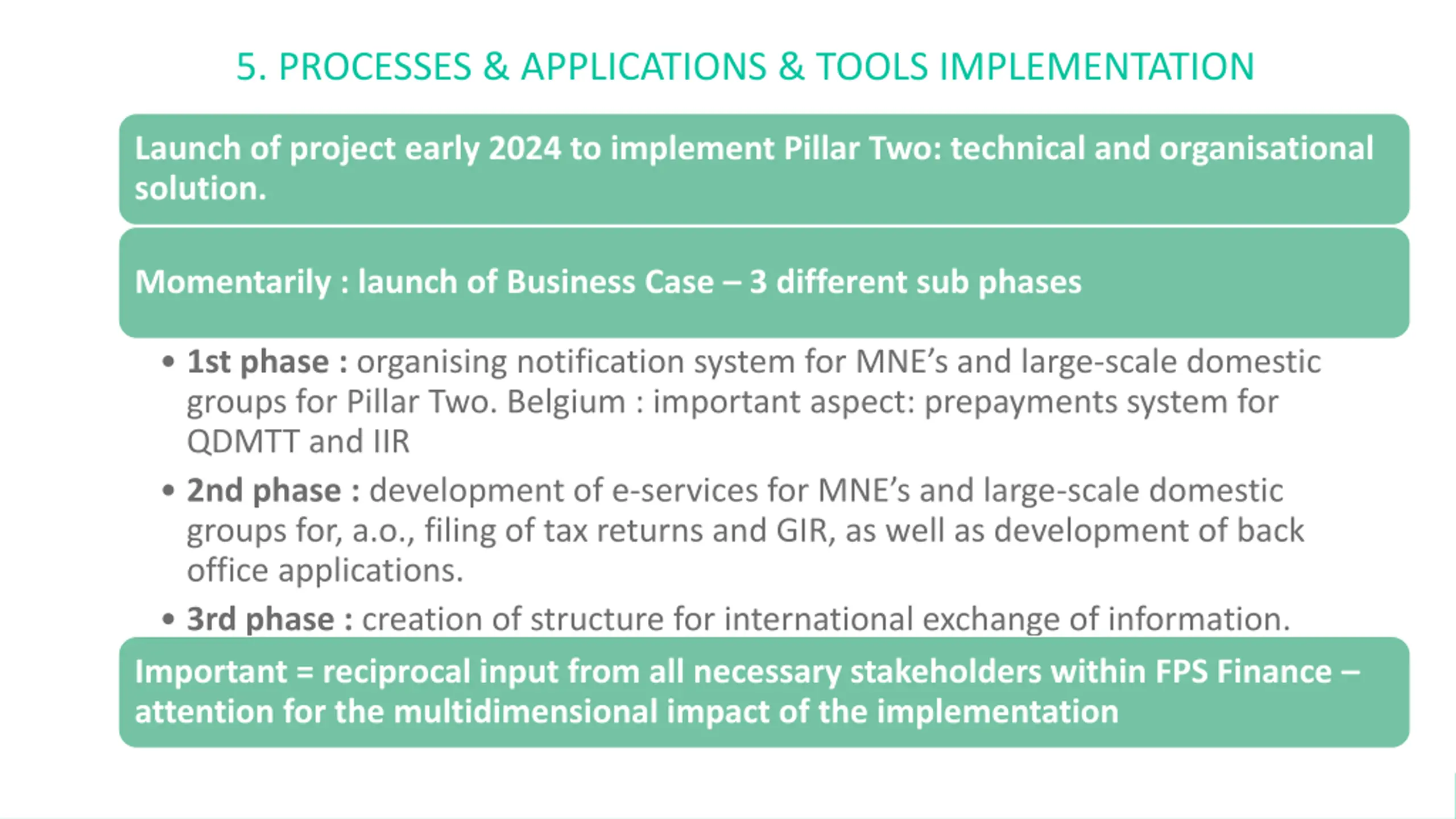 5. PROCESSES & APPLICATIONS & TOOLS IMPLEMENTATION Launch of project early 2024 to implement Pillar Two: technical and organisational solution. Momentarily : launch of Business Case 3 different sub phases 1st phase : organising notification system for MNE s and large-scale domestic groups for Pillar Two. Belgium : important aspect: prepayments system for QDMTT and IIR 2nd phase : development of e-services for MNE s and large-scale domestic groups for, a.o., filing of tax returns and GIR, as well as development of back office applications. 3rd phase : creation of structure for international exchange of information. Important = reciprocal input from all necessary stakeholders within FPS Finance attention for the multidimensional impact of the implementation