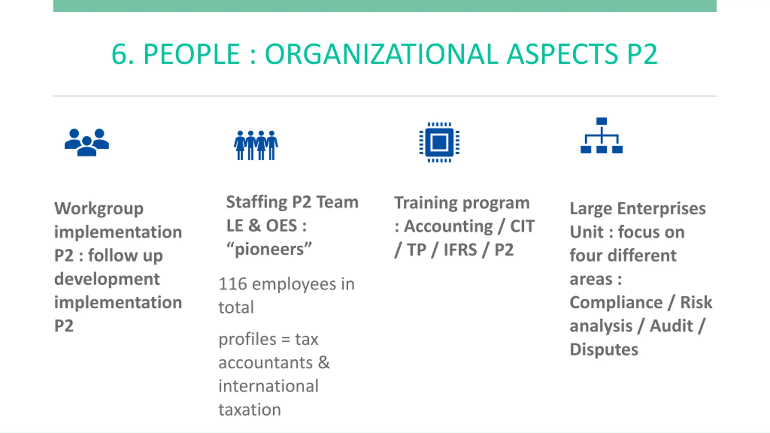 6. PEOPLE : ORGANIZATIONAL ASPECTS P2 Staffing P2 Team LE & OES : pioneers Training program : Accounting / CIT / TP / IFRS / P2 Workgroup implementation P2 : follow up development implementation P2 Large Enterprises Unit : focus on four different areas : Compliance / Risk analysis / Audit / Disputes 116 employees in total profiles = tax accountants & international taxation