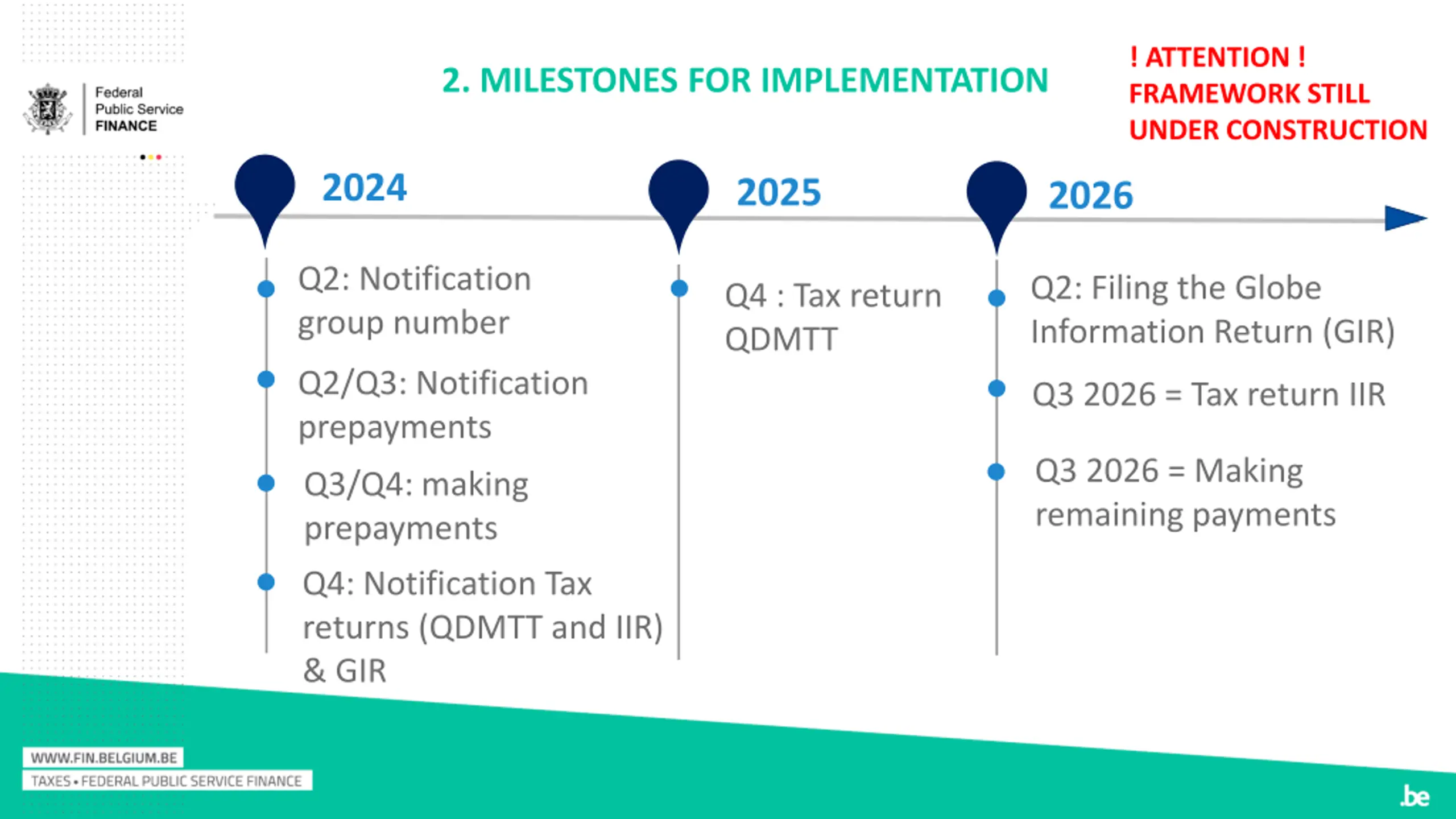 ! ATTENTION ! FRAMEWORK STILL UNDER CONSTRUCTION 2. MILESTONES FOR IMPLEMENTATION 2024 2025 2026 Q2: Notification group number Q2: Filing the Globe Information Return (GIR) Q4 : Tax return QDMTT Q2/Q3: Notification prepayments Q3 2026 = Tax return IIR Q3 2026 = Making remaining payments Q3/Q4: making prepayments Q4: Notification Tax returns (QDMTT and IIR) & GIR