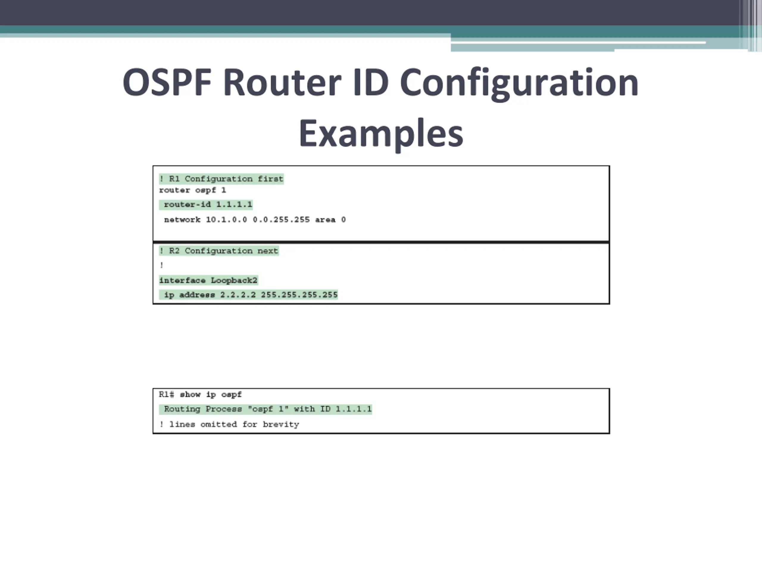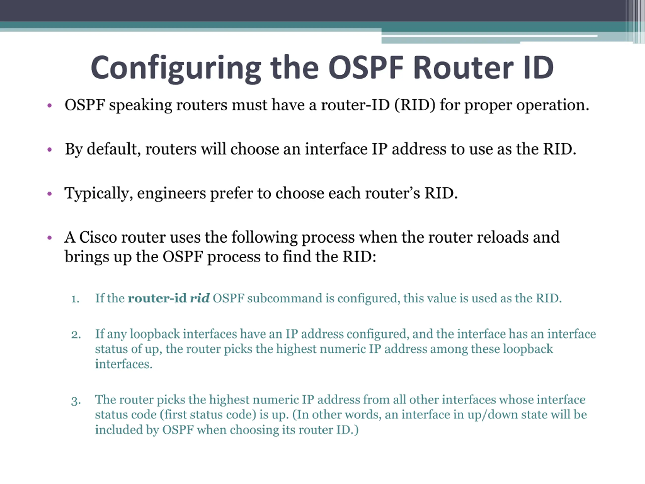Configuring the OSPF Router ID OSPF speaking routers must have a router-ID (RID) for proper operation. By default, routers will choose an interface IP address to use as the RID. Typically, engineers prefer to choose each router s RID. A Cisco router uses the following process when the router reloads and brings up the OSPF process to find the RID: 1. If the router-id ridOSPF subcommand is configured, this value is used as the RID. 2. If any loopback interfaces have an IP address configured, and the interface has an interface status of up, the router picks the highest numeric IP address among these loopback interfaces. 3. The router picks the highest numeric IP address from all other interfaces whose interface status code (first status code) is up. (In other words, an interface in up/down state will be included by OSPF when choosing its router ID.)