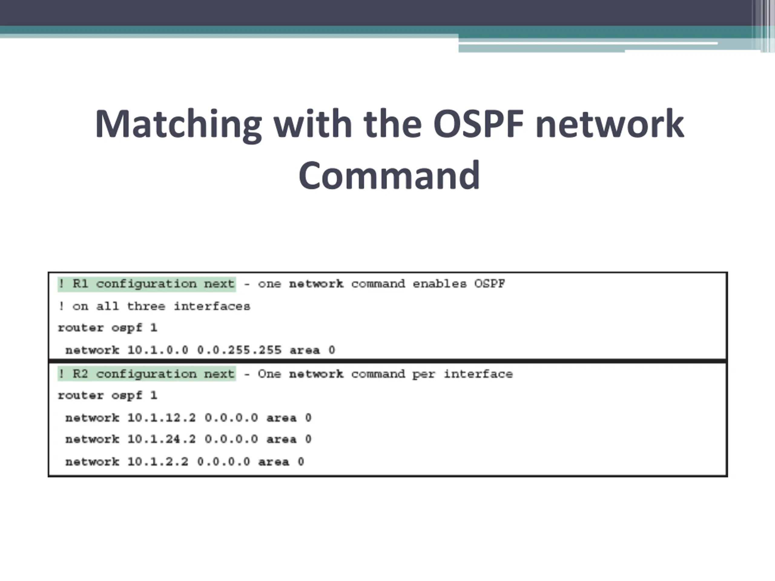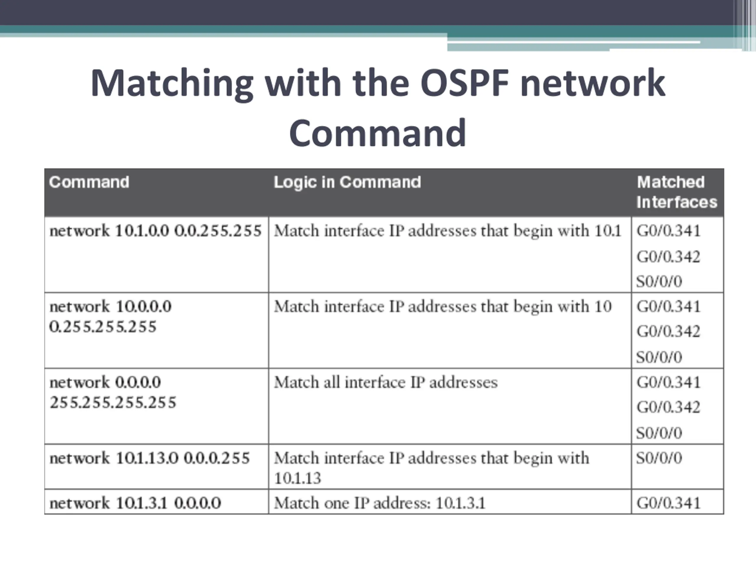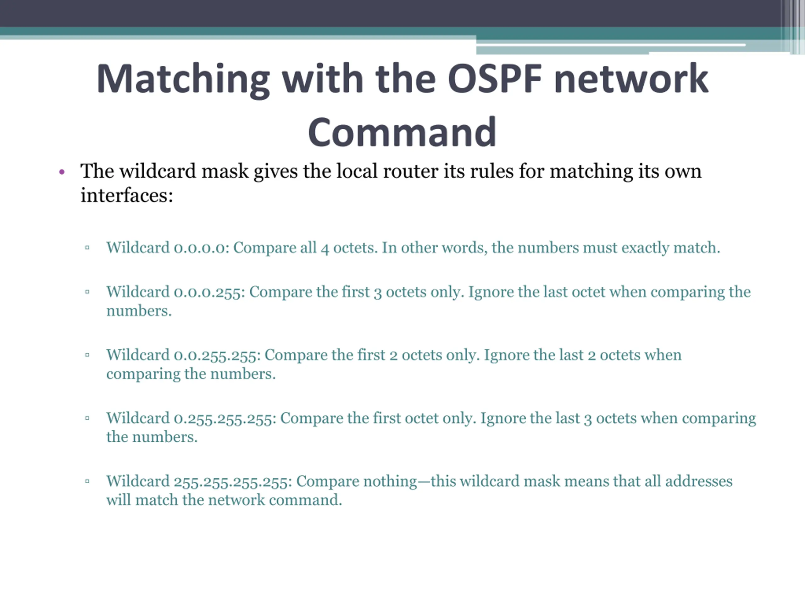 Matching with the OSPF network Command The wildcard mask gives the local router its rules for matching its own interfaces: Wildcard 0.0.0.0: Compare all 4 octets. In other words, the numbers must exactly match. Wildcard 0.0.0.255: Compare the first 3 octets only. Ignore the last octet when comparing the numbers. Wildcard 0.0.255.255: Compare the first 2 octets only. Ignore the last 2 octets when comparing the numbers. Wildcard 0.255.255.255: Compare the first octet only. Ignore the last 3 octets when comparing the numbers. Wildcard 255.255.255.255: Compare nothing this wildcard mask means that all addresses will match the network command.