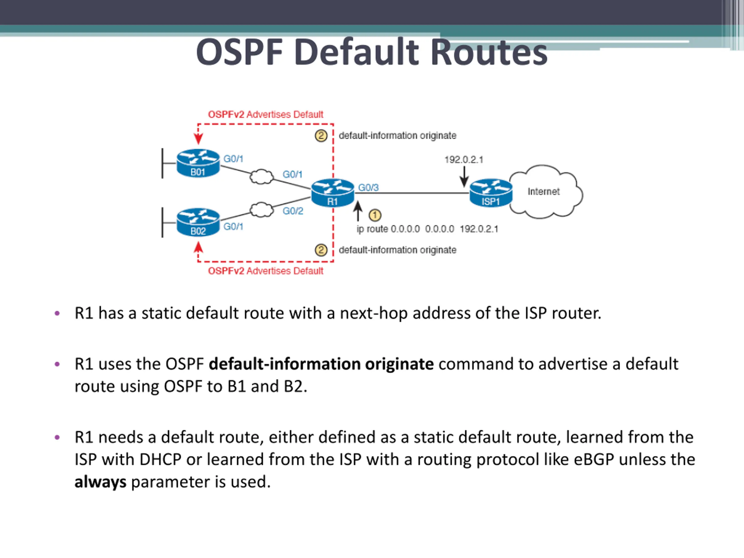 OSPF Default Routes R1 has a static default route with a next-hop address of the ISP router. R1 uses the OSPF default-information originate command to advertise a default route using OSPF to B1 and B2. R1 needs a default route, either defined as a static default route, learned from the ISP with DHCP or learned from the ISP with a routing protocol like eBGP unless the always parameter is used.