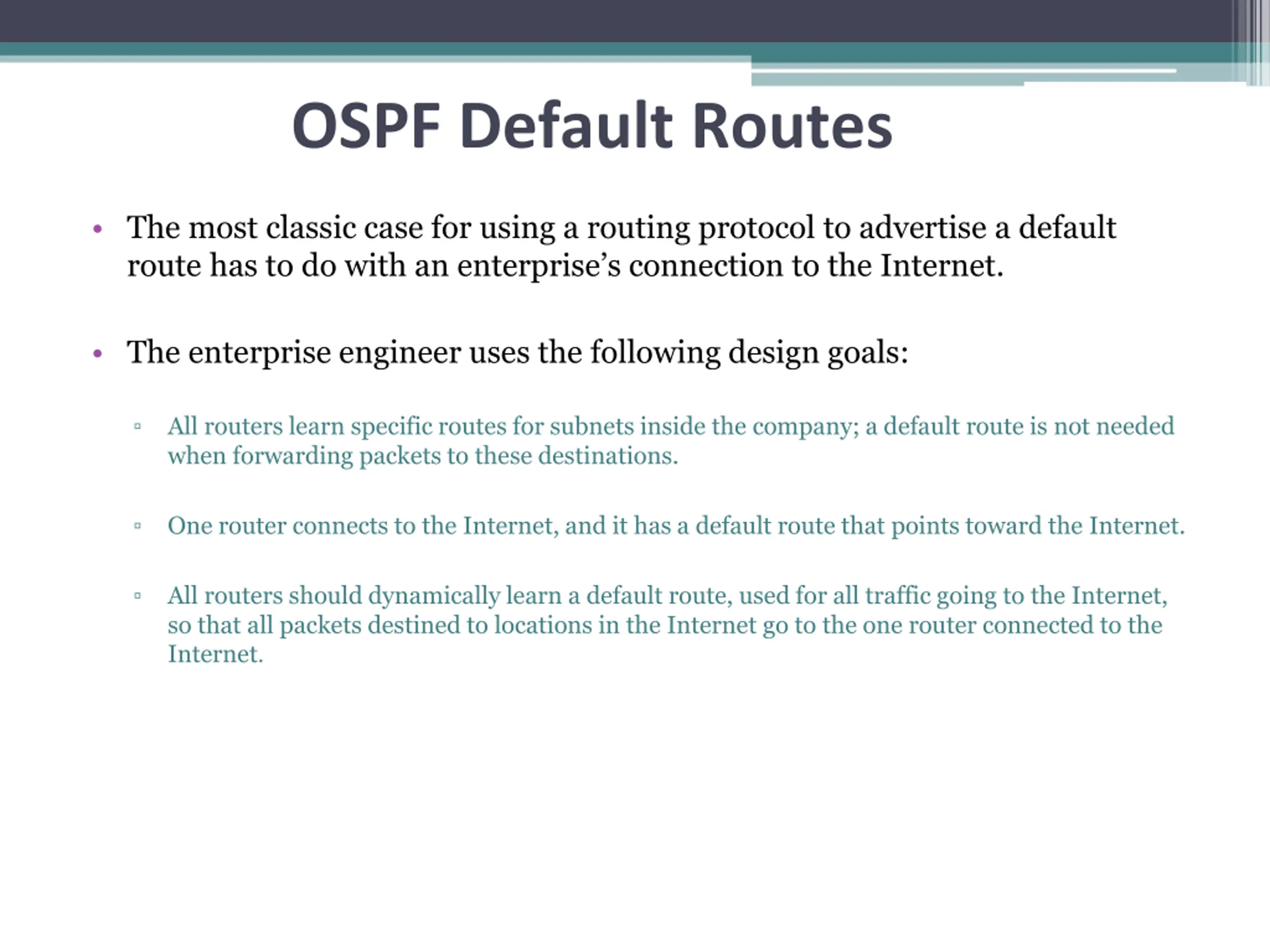 OSPF Default Routes The most classic case for using a routing protocol to advertise a default route has to do with an enterprise s connection to the Internet. The enterprise engineer uses the following design goals: All routers learn specific routes for subnets inside the company; a default route is not needed when forwarding packets to these destinations. One router connects to the Internet, and it has a default route that points toward the Internet. All routers should dynamically learn a default route, used for all traffic going to the Internet, so that all packets destined to locations in the Internet go to the one router connected to the Internet.