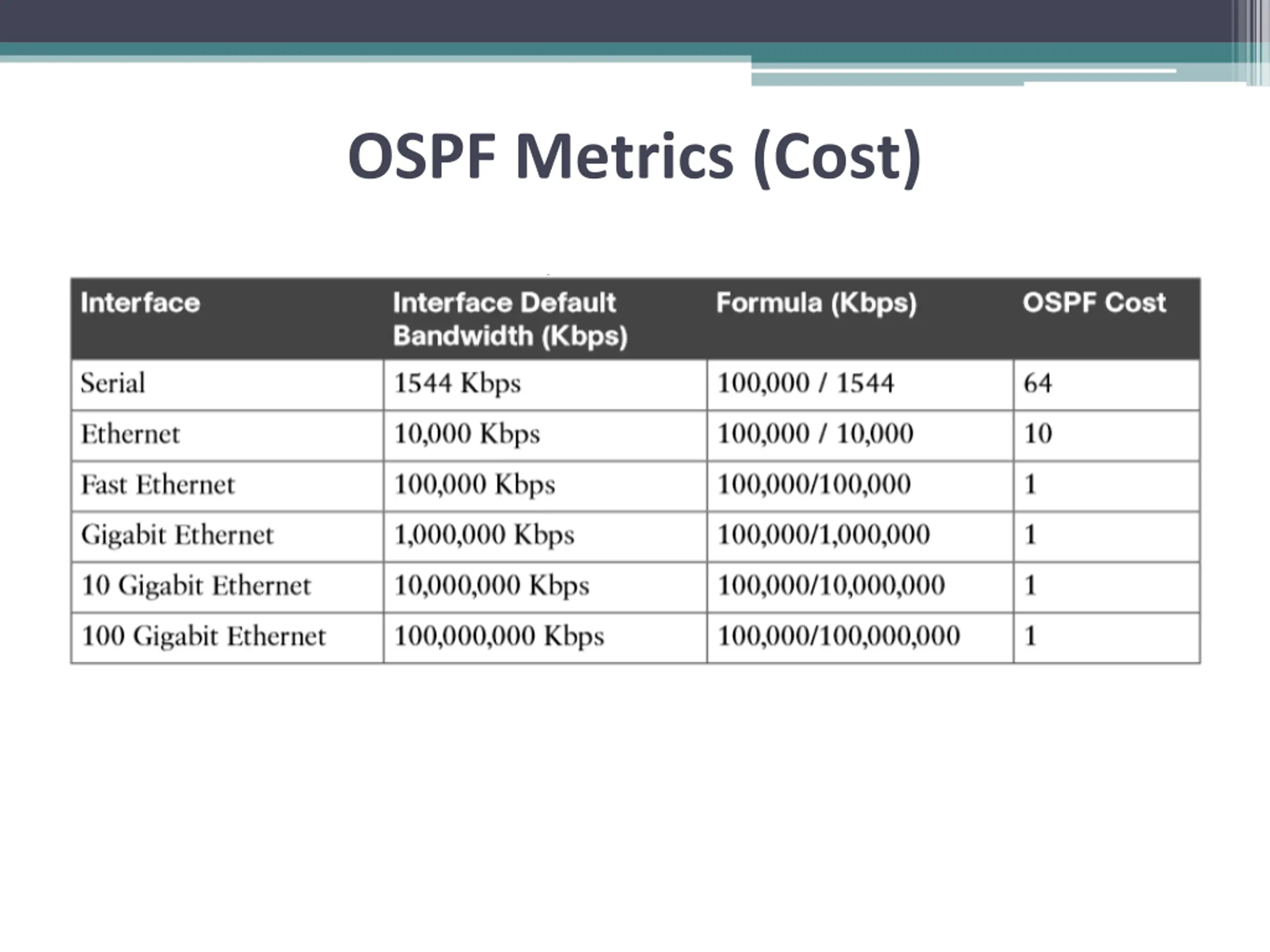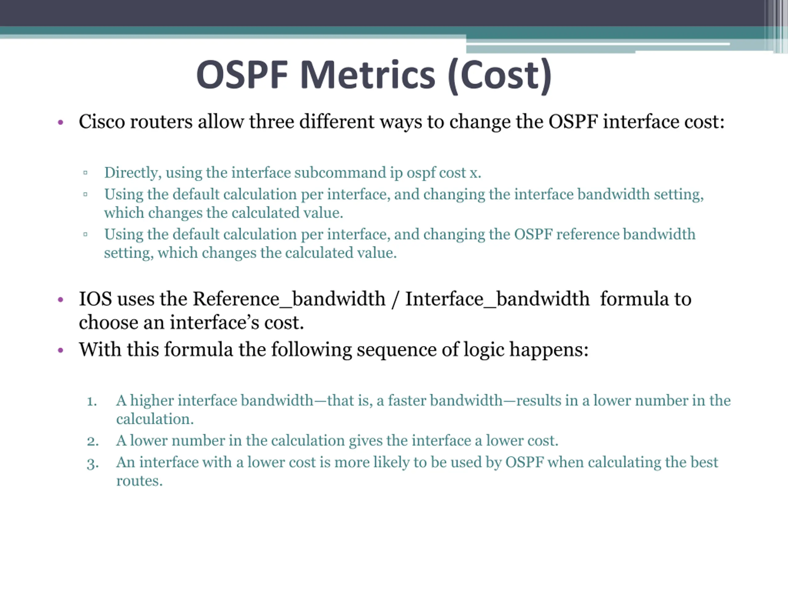 OSPF Metrics (Cost) Cisco routers allow three different ways to change the OSPF interface cost: Directly, using the interface subcommand ip ospf cost x. Using the default calculation per interface, and changing the interface bandwidth setting, which changes the calculated value. Using the default calculation per interface, and changing the OSPF reference bandwidth setting, which changes the calculated value. IOS uses the Reference_bandwidth / Interface_bandwidth formula to choose an interface s cost. With this formula the following sequence of logic happens: 1. A higher interface bandwidth that is, a faster bandwidth results in a lower number in the calculation. A lower number in the calculation gives the interface a lower cost. An interface with a lower cost is more likely to be used by OSPF when calculating the best routes. 2. 3.