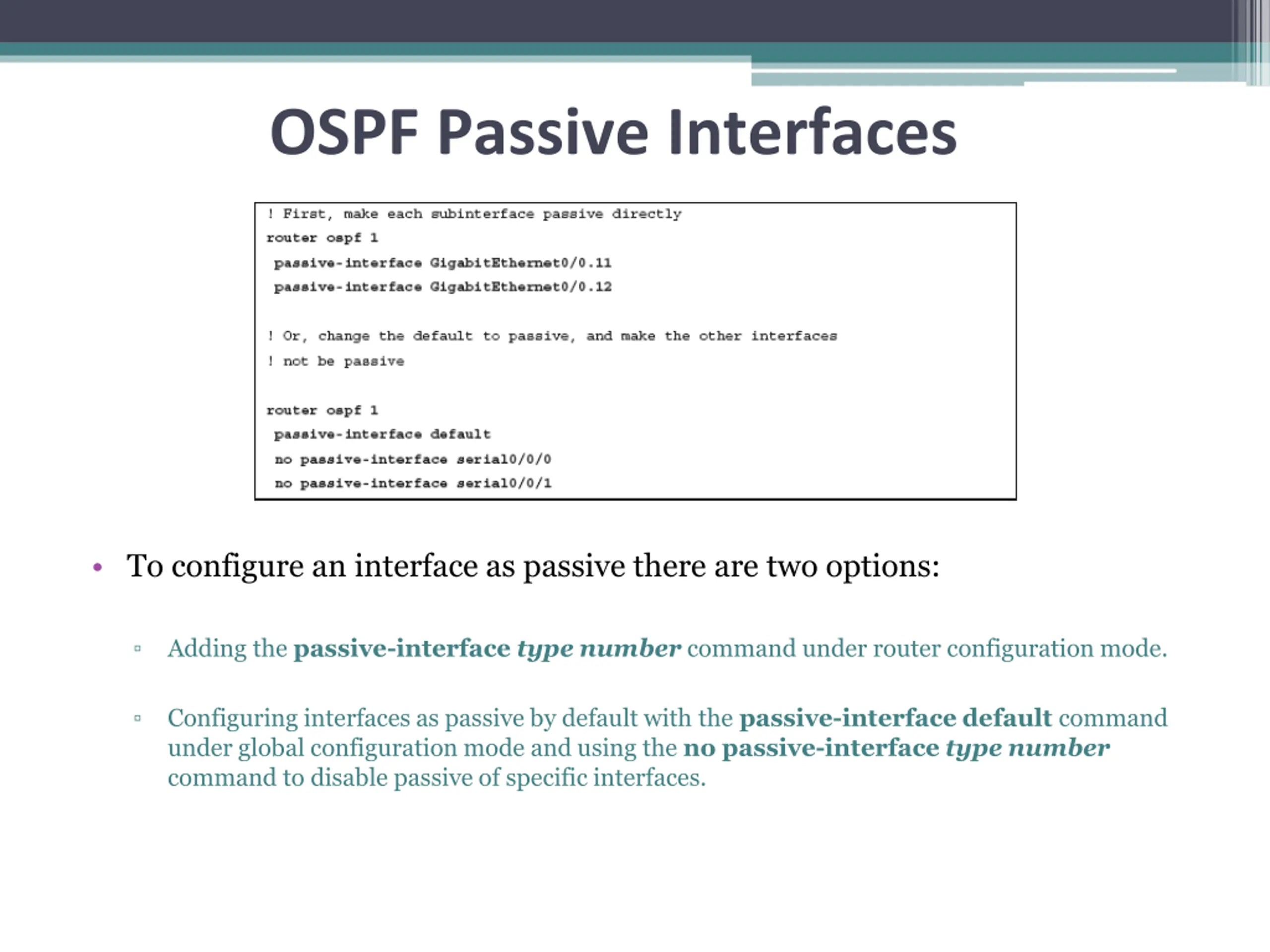 OSPF Passive Interfaces To configure an interface as passive there are two options: Adding the passive-interface type number command under router configuration mode. Configuring interfaces as passive by default with the passive-interface default command under global configuration mode and using the no passive-interface type number command to disable passive of specific interfaces.
