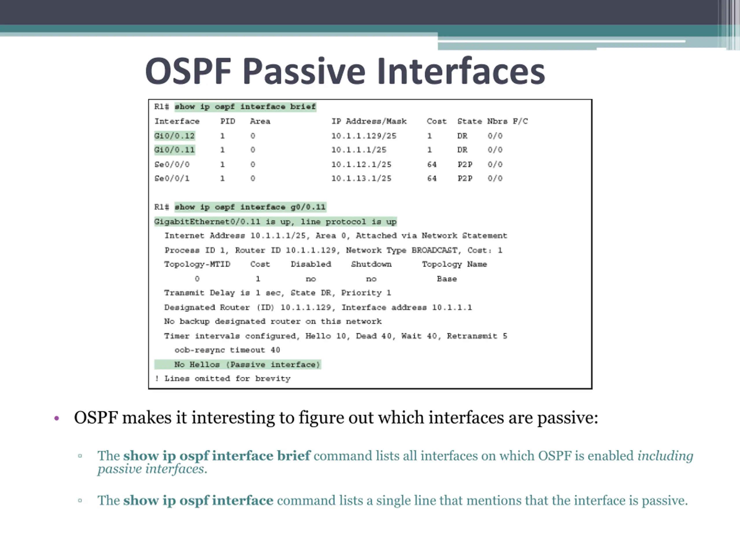 OSPF Passive Interfaces OSPF makes it interesting to figure out which interfaces are passive: The show ip ospf interface brief command lists all interfaces on which OSPF is enabled including passive interfaces. The show ip ospf interface command lists a single line that mentions that the interface is passive.