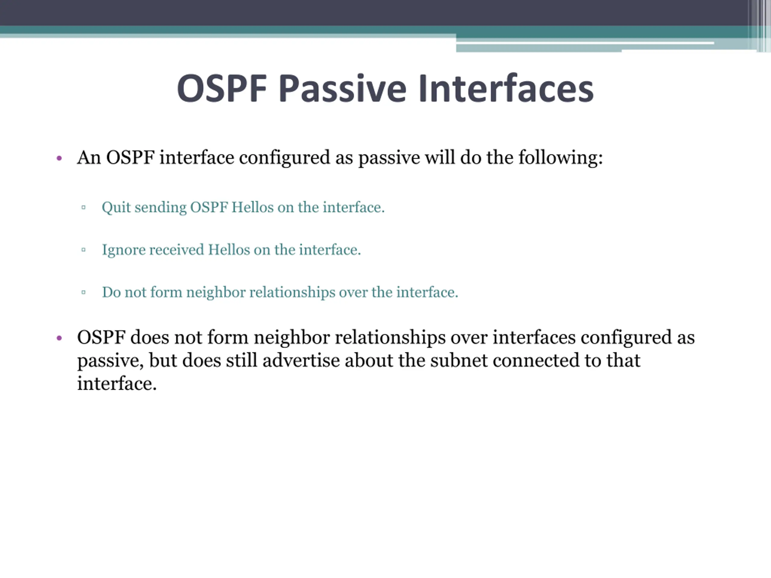 OSPF Passive Interfaces An OSPF interface configured as passive will do the following: Quit sending OSPF Hellos on the interface. Ignore received Hellos on the interface. Do not form neighbor relationships over the interface. OSPF does not form neighbor relationships over interfaces configured as passive, but does still advertise about the subnet connected to that interface.