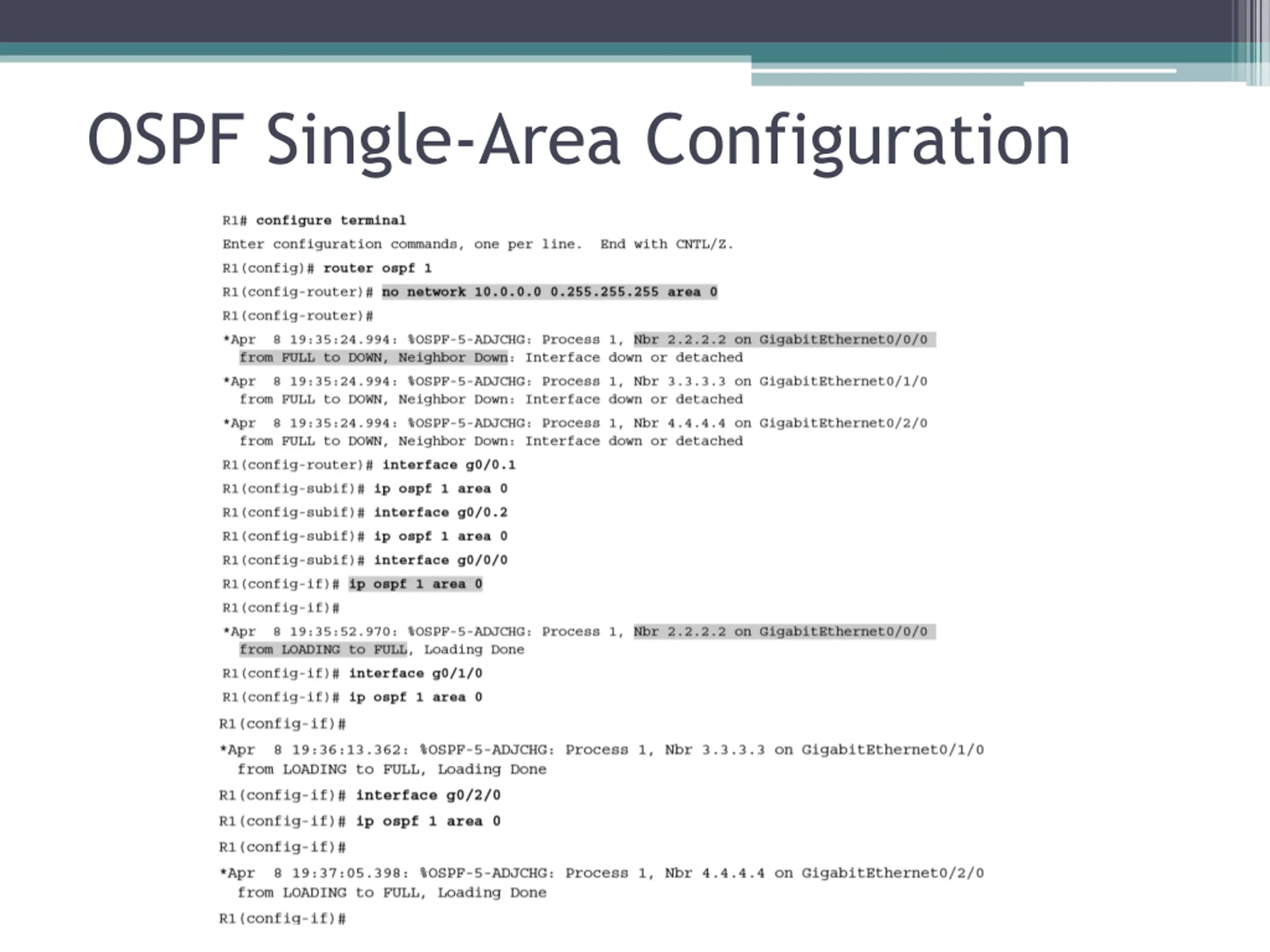 Implementing Single-Area OSPF The router ospf 1 global command puts the users into OSPF configuration mode and sets the OSPF process-id to 1. This process-id just needs to be unique on the local router and be between 1 and 65,535. The OSPF network command tells the router to find its local interfaces that match the first two parameters in the command. Those interfaces then discover neighbors, create neighbor relationships and assign the interface to the area listed.