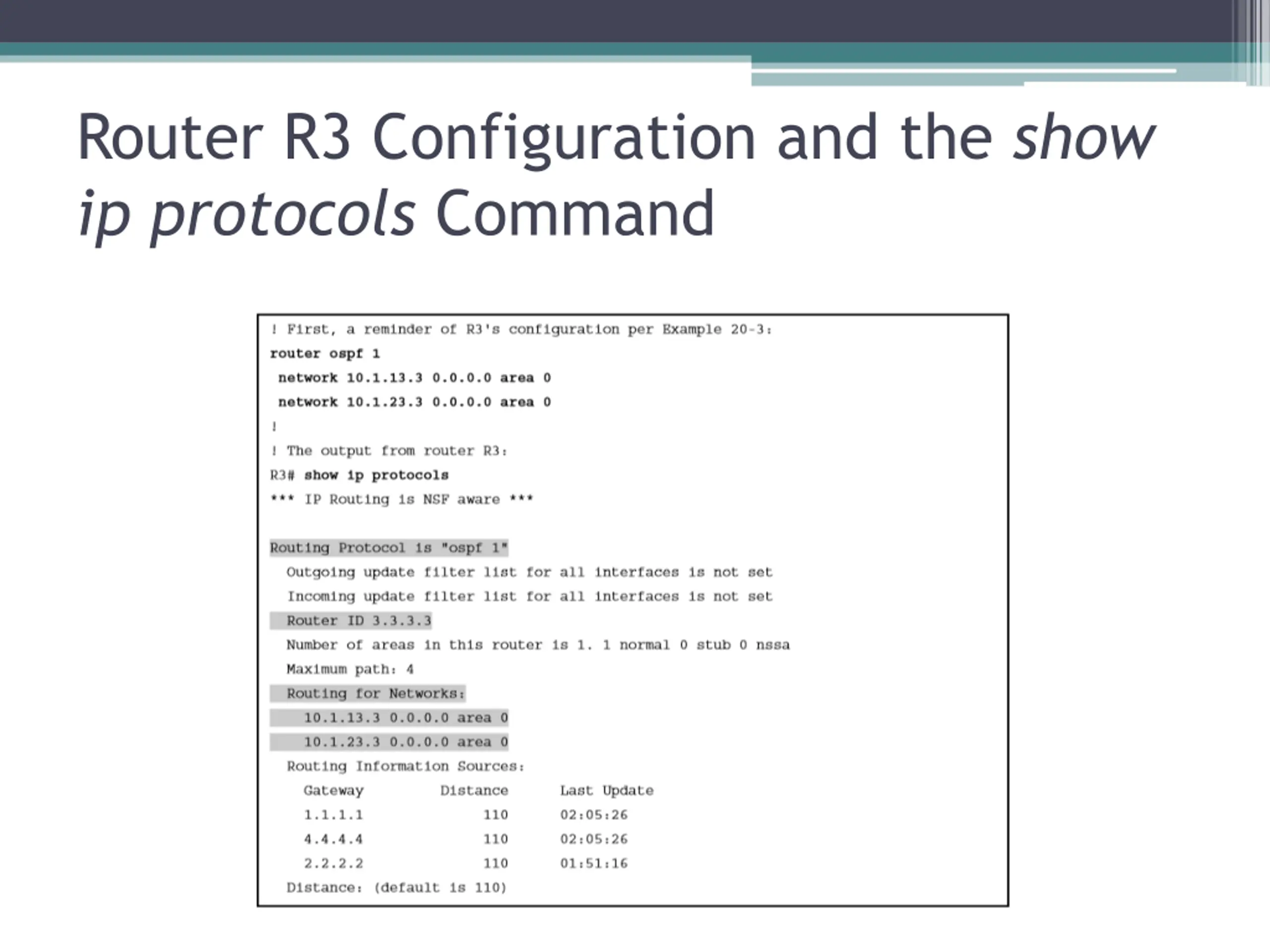 Verifying OSPFv2 Single Area Interface: This is the local router s interface connected to the neighbor. For example, the first neighbor in the list is reachable through R3 s S0/0/0 interface. Address: This is the neighbor s IP address on that link. Again, for this first neighbor, the neighbor, which is R1, uses IP address 10.1.13.1. State: While many possible states exist, for the details discussed in this chapter, FULL is the correct and fully working state in this case. Neighbor ID: This is the router ID of the neighbor.