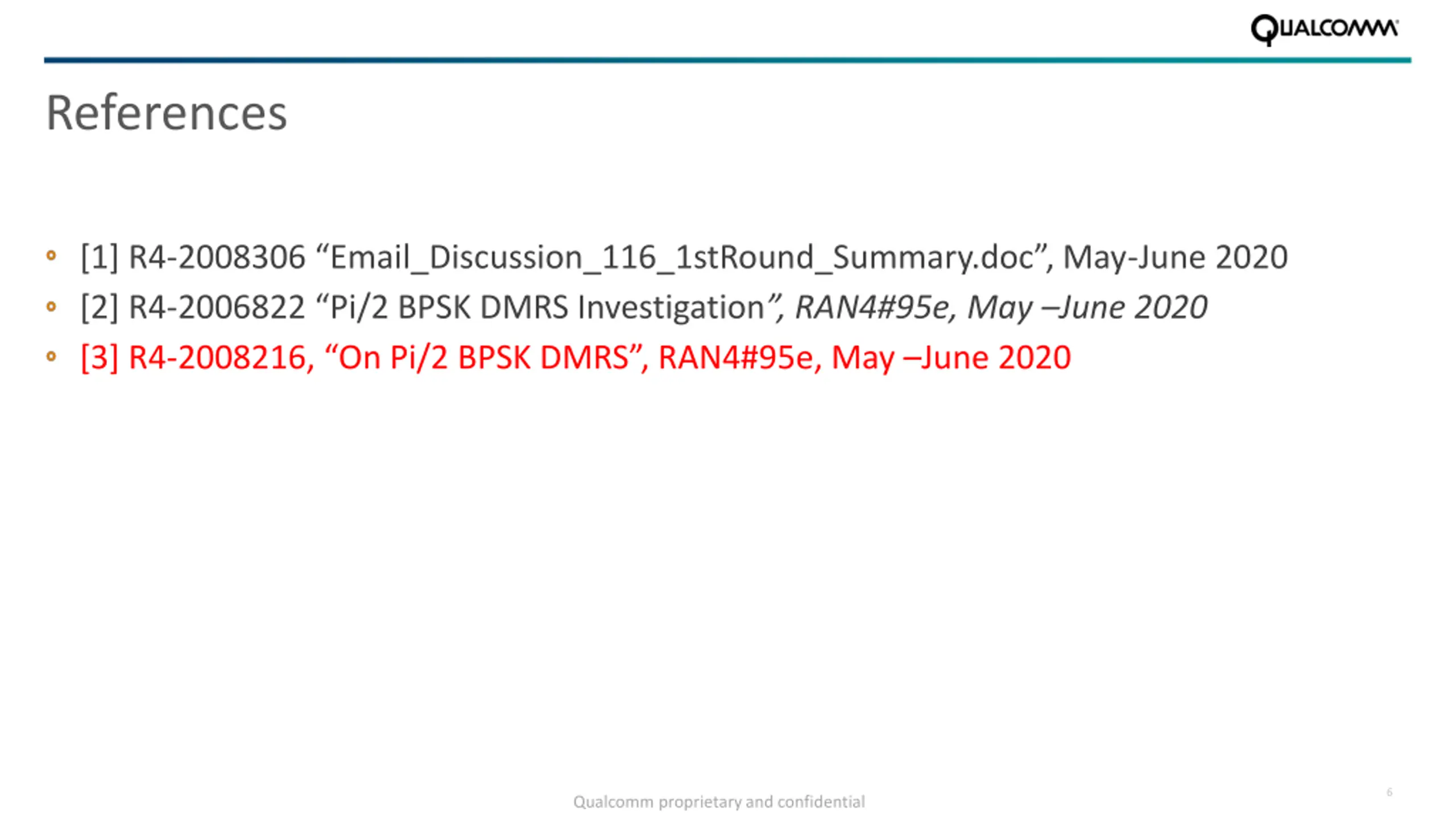 References [1] R4-2008306 Email_Discussion_116_1stRound_Summary.doc , May-June 2020 [2] R4-2006822 Pi/2 BPSK DMRS Investigation , RAN4#95e, May June 2020 [3] R4-2008216, On Pi/2 BPSK DMRS , RAN4#95e, May June 2020 6 Qualcomm proprietary and confidential