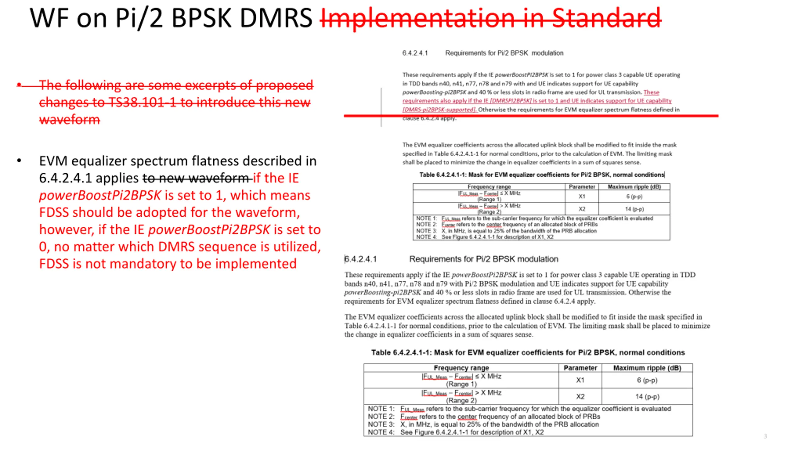 WF on Pi/2 BPSK DMRS Implementation in Standard The following are some excerpts of proposed changes to TS38.101-1 to introduce this new waveform EVM equalizer spectrum flatness described in 6.4.2.4.1 applies to new waveform if the IE powerBoostPi2BPSK is set to 1, which means FDSS should be adopted for the waveform, however, if the IE powerBoostPi2BPSK is set to 0, no matter which DMRS sequence is utilized, FDSS is not mandatory to be implemented 3
