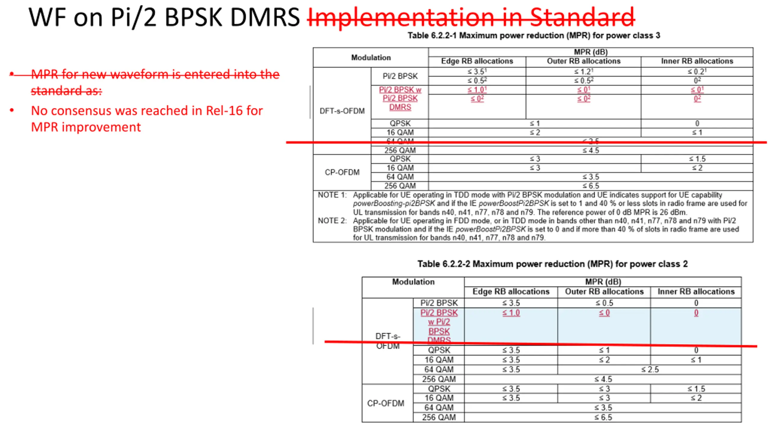 WF on Pi/2 BPSK DMRS Implementation in Standard MPR for new waveform is entered into the standard as: No consensus was reached in Rel-16 for MPR improvement 4