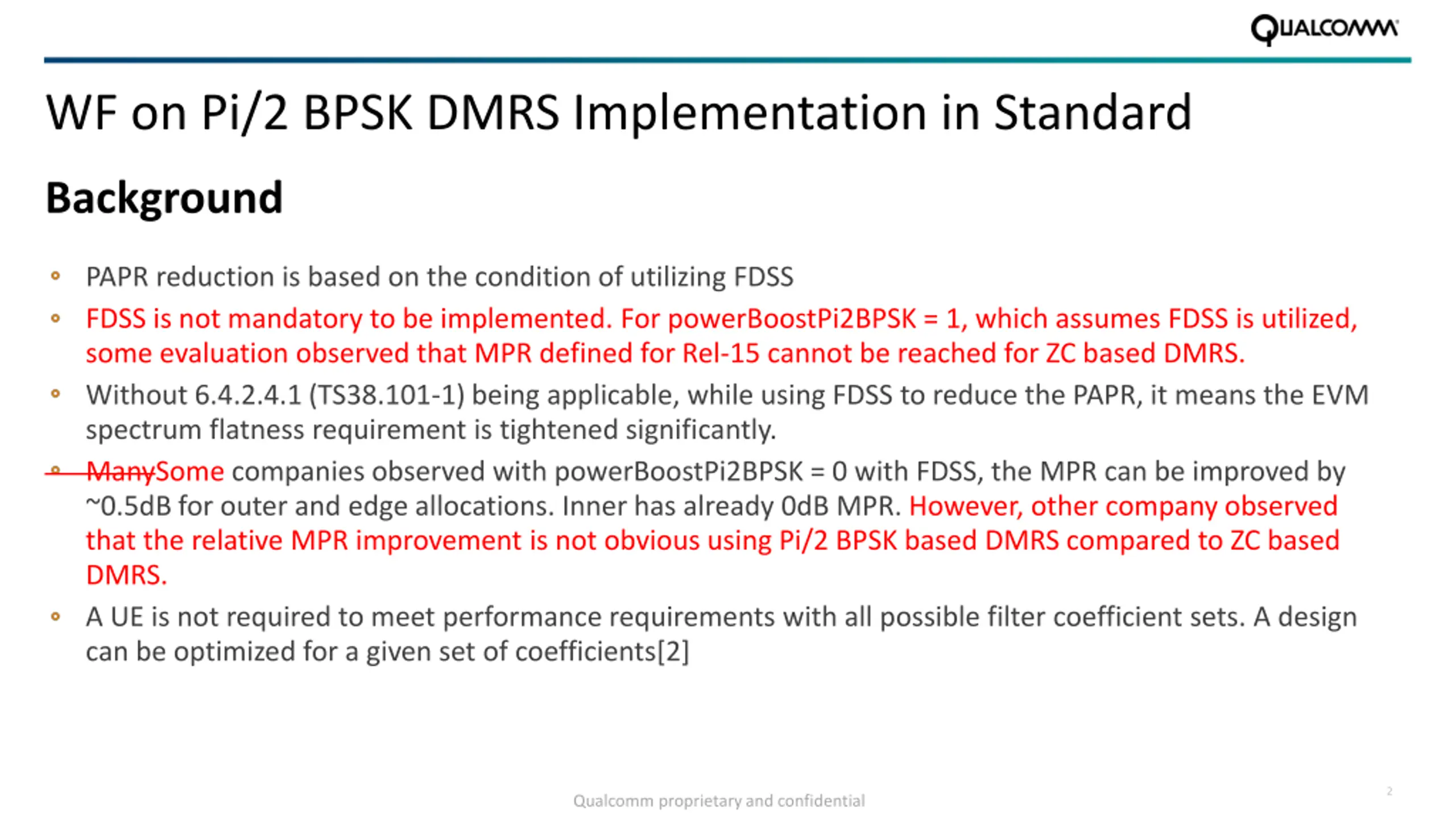 WF on Pi/2 BPSK DMRS Implementation in Standard Background PAPR reduction is based on the condition of utilizing FDSS FDSS is not mandatory to be implemented. For powerBoostPi2BPSK = 1, which assumes FDSS is utilized, some evaluation observed that MPR defined for Rel-15 cannot be reached for ZC based DMRS. Without 6.4.2.4.1 (TS38.101-1) being applicable, while using FDSS to reduce the PAPR, it means the EVM spectrum flatness requirement is tightened significantly. ManySome companies observed with powerBoostPi2BPSK = 0 with FDSS, the MPR can be improved by ~0.5dB for outer and edge allocations. Inner has already 0dB MPR. However, other company observed that the relative MPR improvement is not obvious using Pi/2 BPSK based DMRS compared to ZC based DMRS. A UE is not required to meet performance requirements with all possible filter coefficient sets. A design can be optimized for a given set of coefficients[2] 2 Qualcomm proprietary and confidential