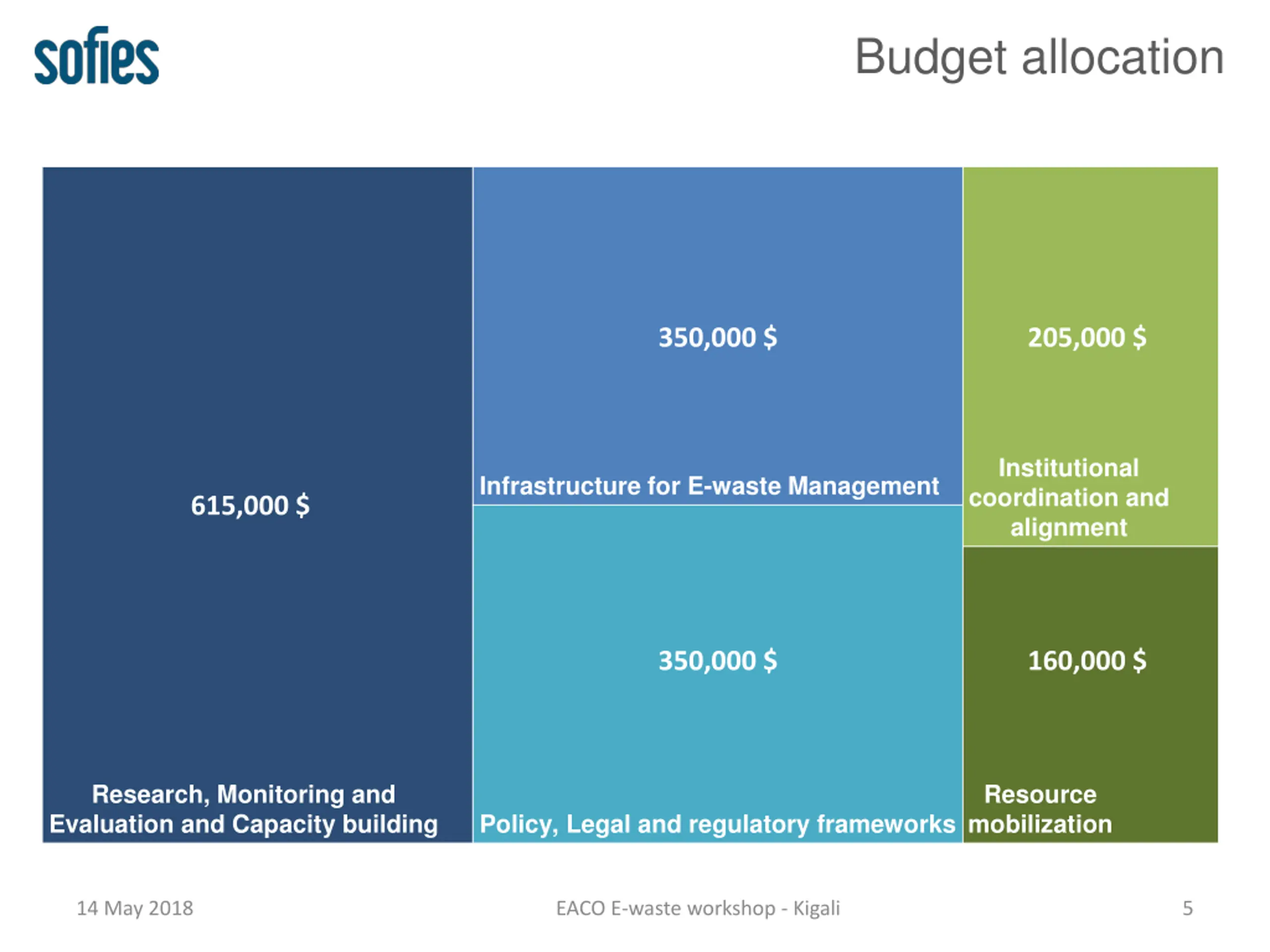 Why do we need funding? The strategy laid down an ambitious and coherent plan to address the current gaps in the region: Development, adoption and ENFORCEMENT of policies for e-waste management Mapping infrastructure (& development of plan to ensure their deployment) Ensure capacity is developed, locally Funds are currently lacking and sources need to be identified, under two scenarios: 1. Institutional donors / projects (Money to EACO) 2. Alignment with ongoing projects / funding opportunities already committed by donors (Money supporting activities in the EACO strategy) 14 May 2018 EACO E-waste workshop - Kigali 4