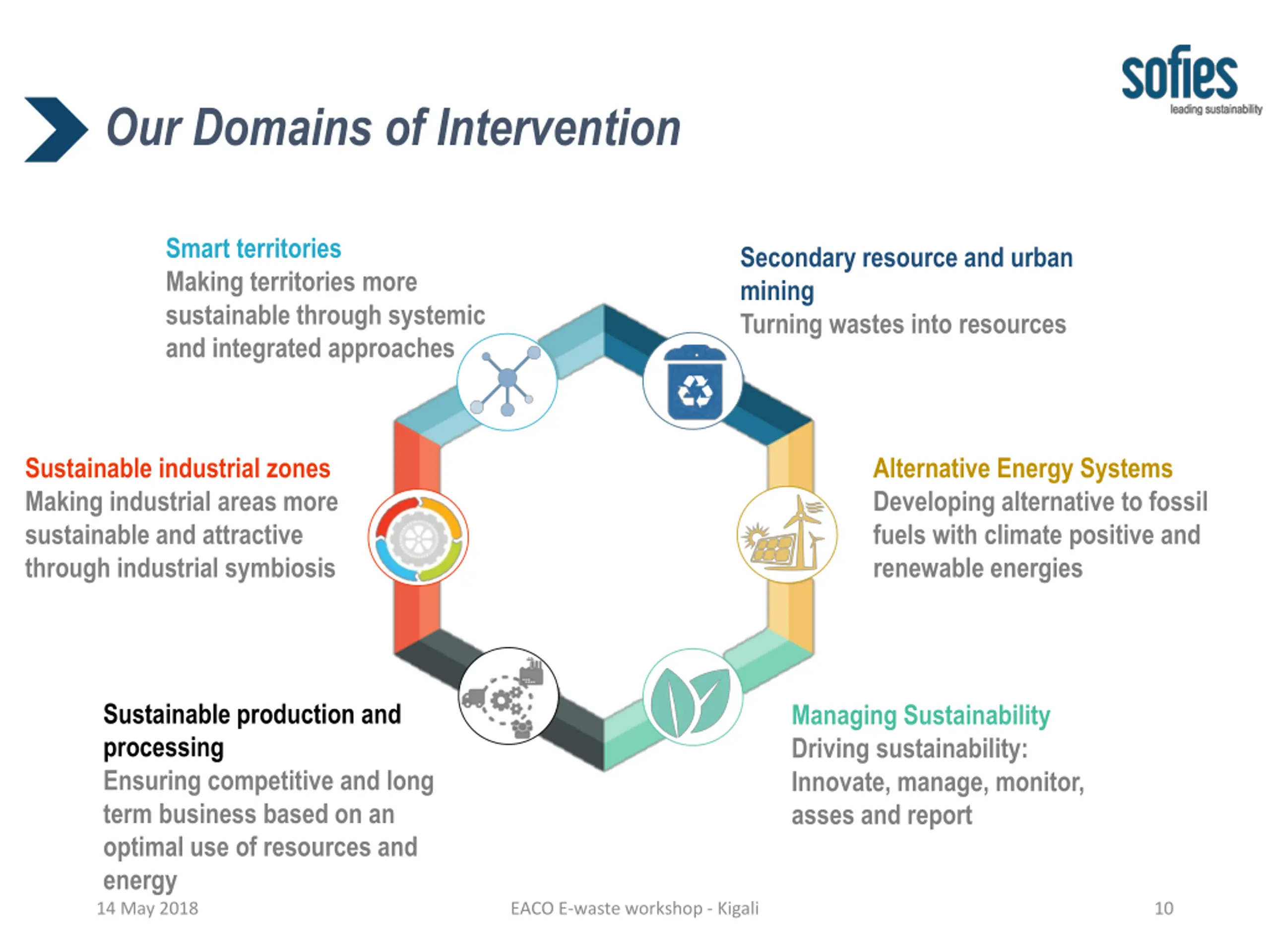 Our Domains of Intervention Smart territories Making territories more sustainable through systemic and integrated approaches Secondary resource and urban mining Turning wastes into resources Sustainable industrial zones Making industrial areas more sustainable and attractive through industrial symbiosis Alternative Energy Systems Developing alternative to fossil fuels with climate positive and renewable energies Sustainable production and processing Ensuring competitive and long term business based on an optimal use of resources and energy 14 May 2018 Managing Sustainability Driving sustainability: Innovate, manage, monitor, asses and report EACO E-waste workshop - Kigali 10