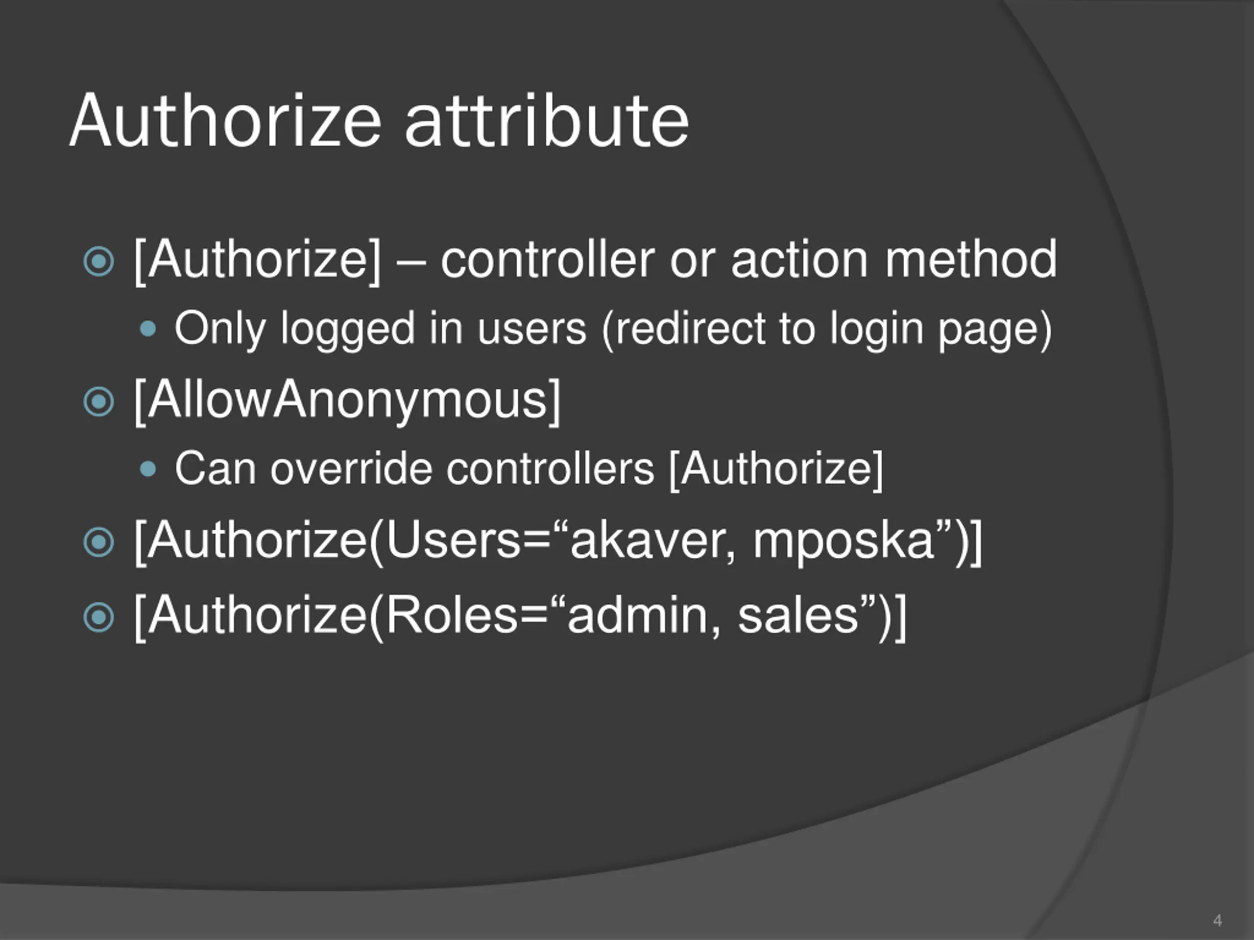 Authorize attribute [Authorize] controller or action method Only logged in users (redirect to login page) [AllowAnonymous] Can override controllers [Authorize] [Authorize(Users= akaver, mposka )] [Authorize(Roles= admin, sales )] 4