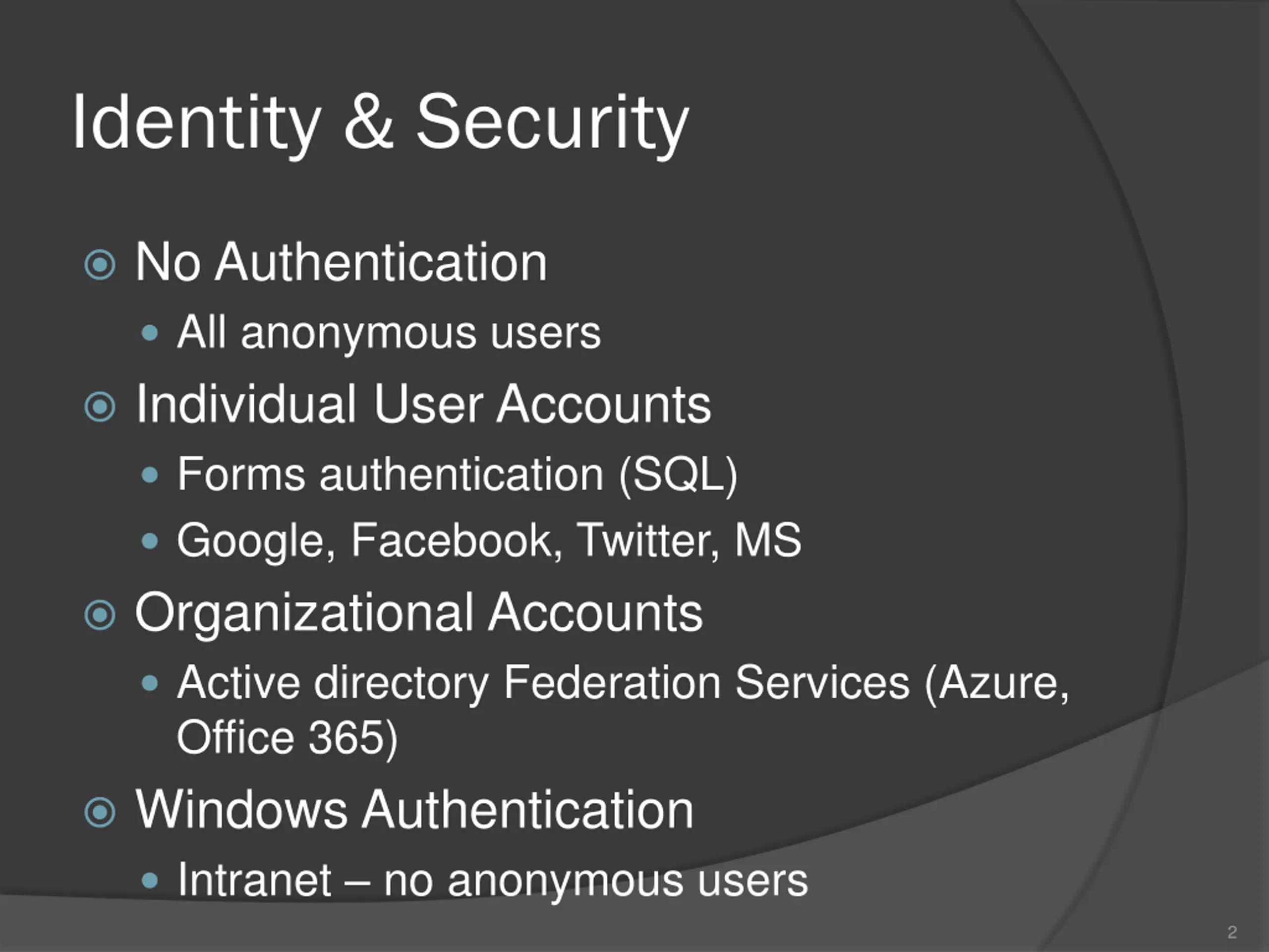 Identity & Security No Authentication All anonymous users Individual User Accounts Forms authentication (SQL) Google, Facebook, Twitter, MS Organizational Accounts Active directory Federation Services (Azure, Office 365) Windows Authentication Intranet no anonymous users 2